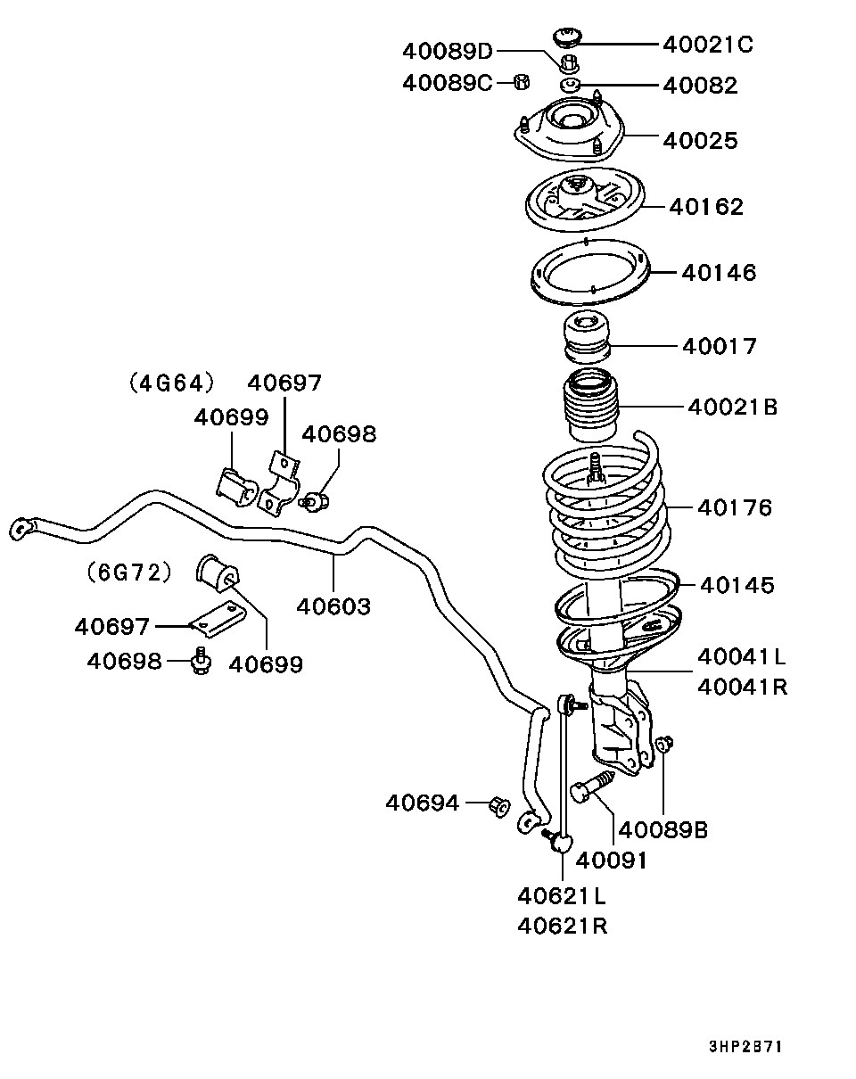 3. Передняя пружина (позиция 40176, в оригинале имеет 2 голубых метки) — MR297610. Качественных аналогов, к сожалению, нет (да и вообще никаких нет), но можно попробовать поставить пружины от Hyundai Trajet: оригинал Hyundai 546303A110, аналоги KYB RA2977, Kilen 14821, Lesjofors 4037220. Есть одна запись, где на Эклипс была установлена пружина от мазды OBK C4Z71831 — но надо проверять, как она будет работать на галанте и встанет ли вообще. Также есть информация, что могут подойти пружины от Mitsubishi Grandis 2.4 — MR594344, аналог OBK C4M10041.