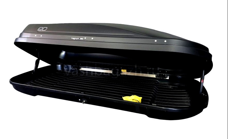 На этот раз купил бокс той же серии Магнум, но большего размера: длина 185 см (на 10 см больше предыдущего), ширина 85см (на 40 см больше), соответственно и большая вместимость — 390л. По сравнению с прежним 330-м боксом этот вдвое шире, вместительнее. В цвете черный глянец отлично смотрится на машинке.