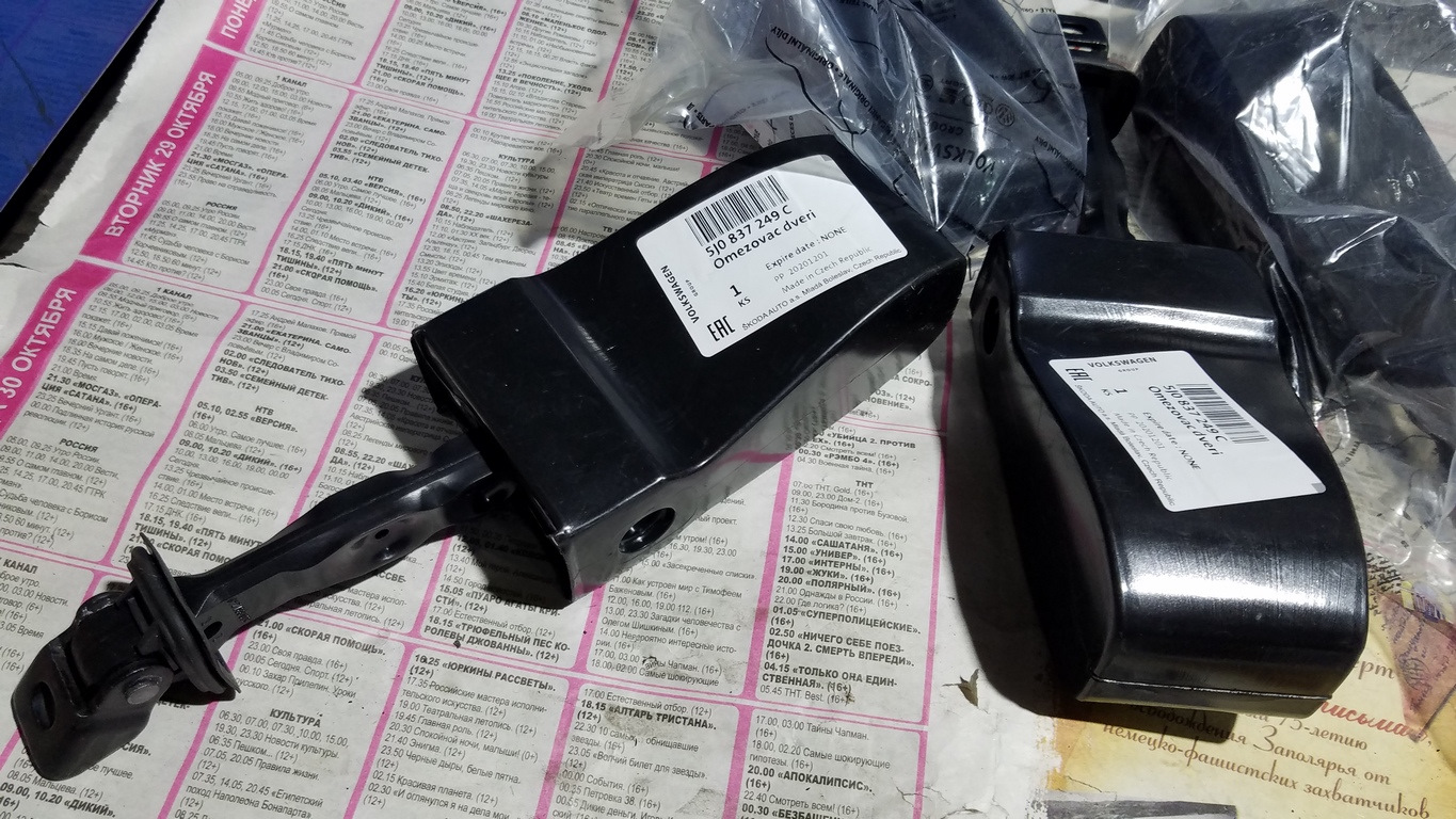 Полез по просторам инета. Весь тойотовский сектор Drive2 оказался наполнен постами про Камри, РАВ4 и т.д. о замене ограничителей на шкодовские, от Фабии 5J0837249C, и народ в восторге от них. Размер по болтам 50 мм, почти похоже, надо чуть подточить дырки в двери и все встает и работает как надо. И цена приемлемая, под Новый год было около 750 р за штуку. Заказал 4 шт, получил уже после НГ, выбрал время и занялся установкой.