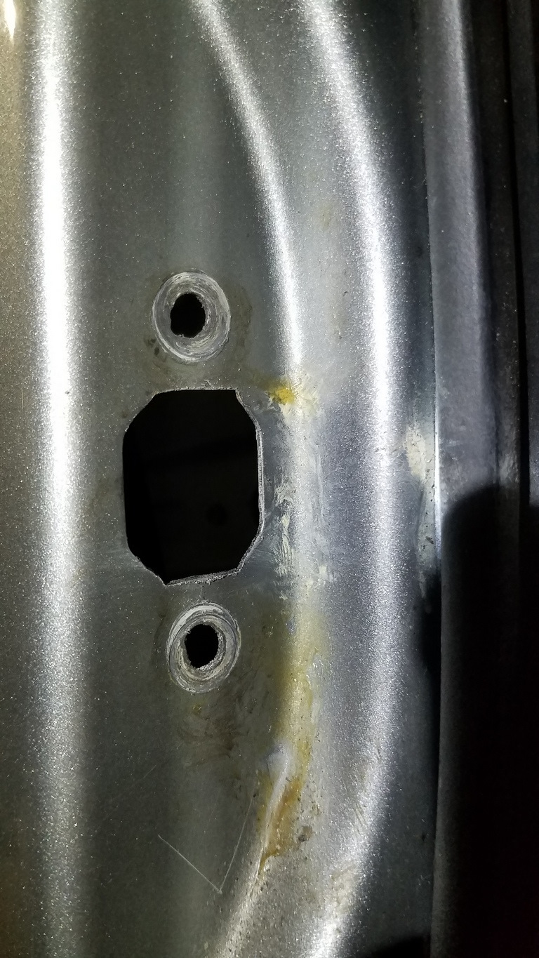 Пробую засунуть фордовский — а хрен там, не лезет, скоба шире чем дырка в двери. Но эту проблему решает надфиль, чуть подточил сверху и снизу, буквально на миллиметр расширив дырку.