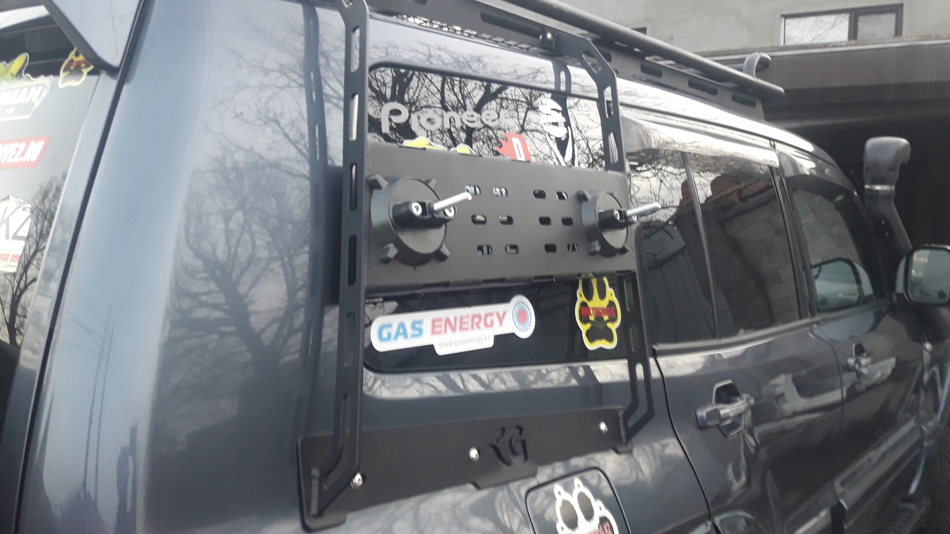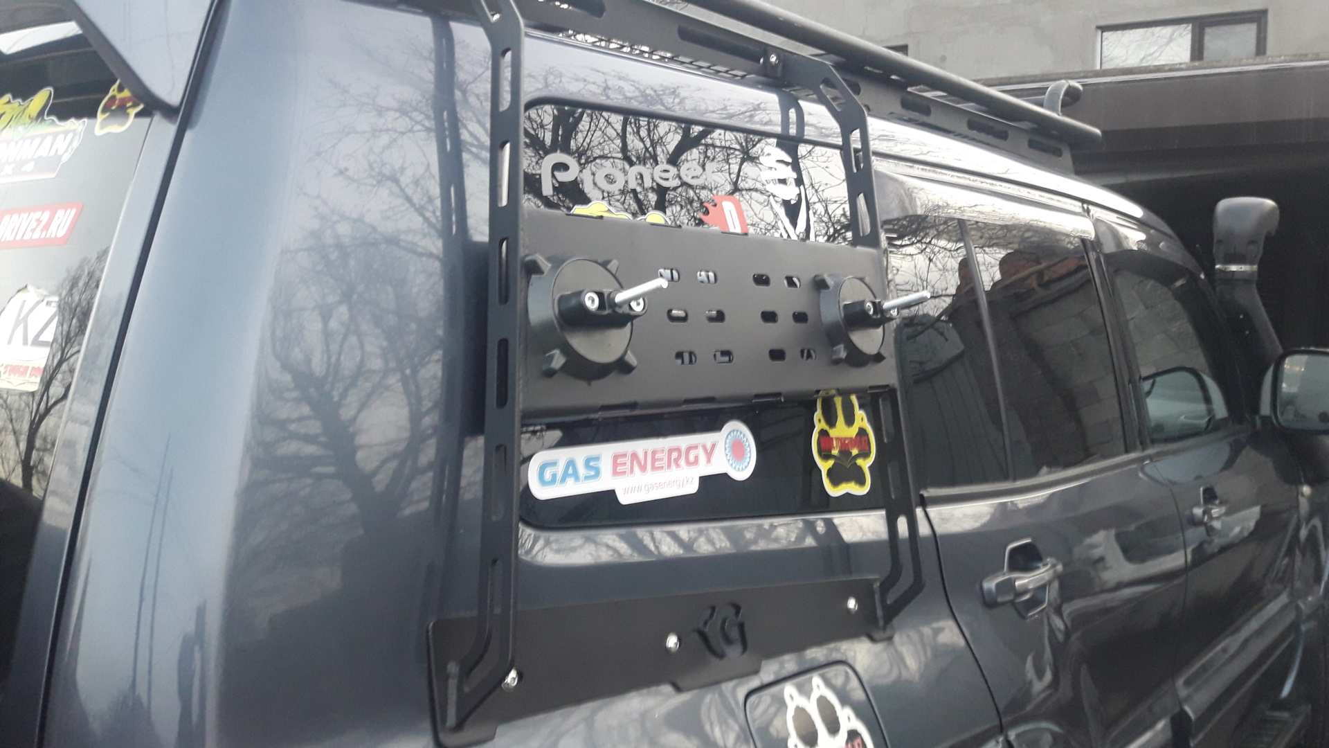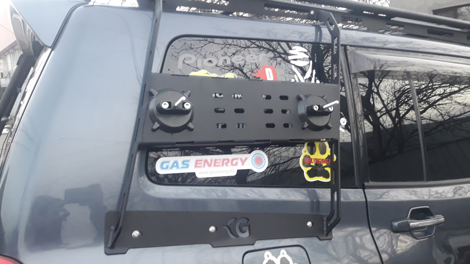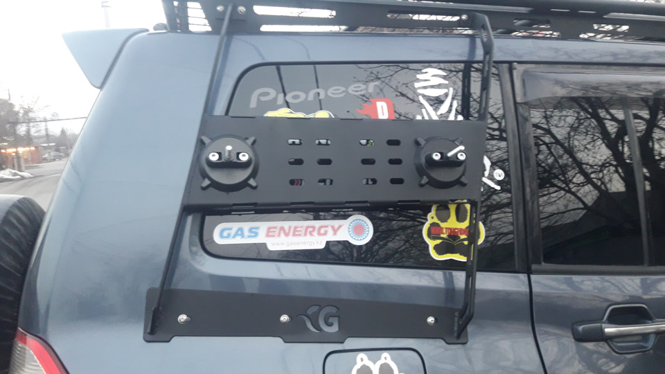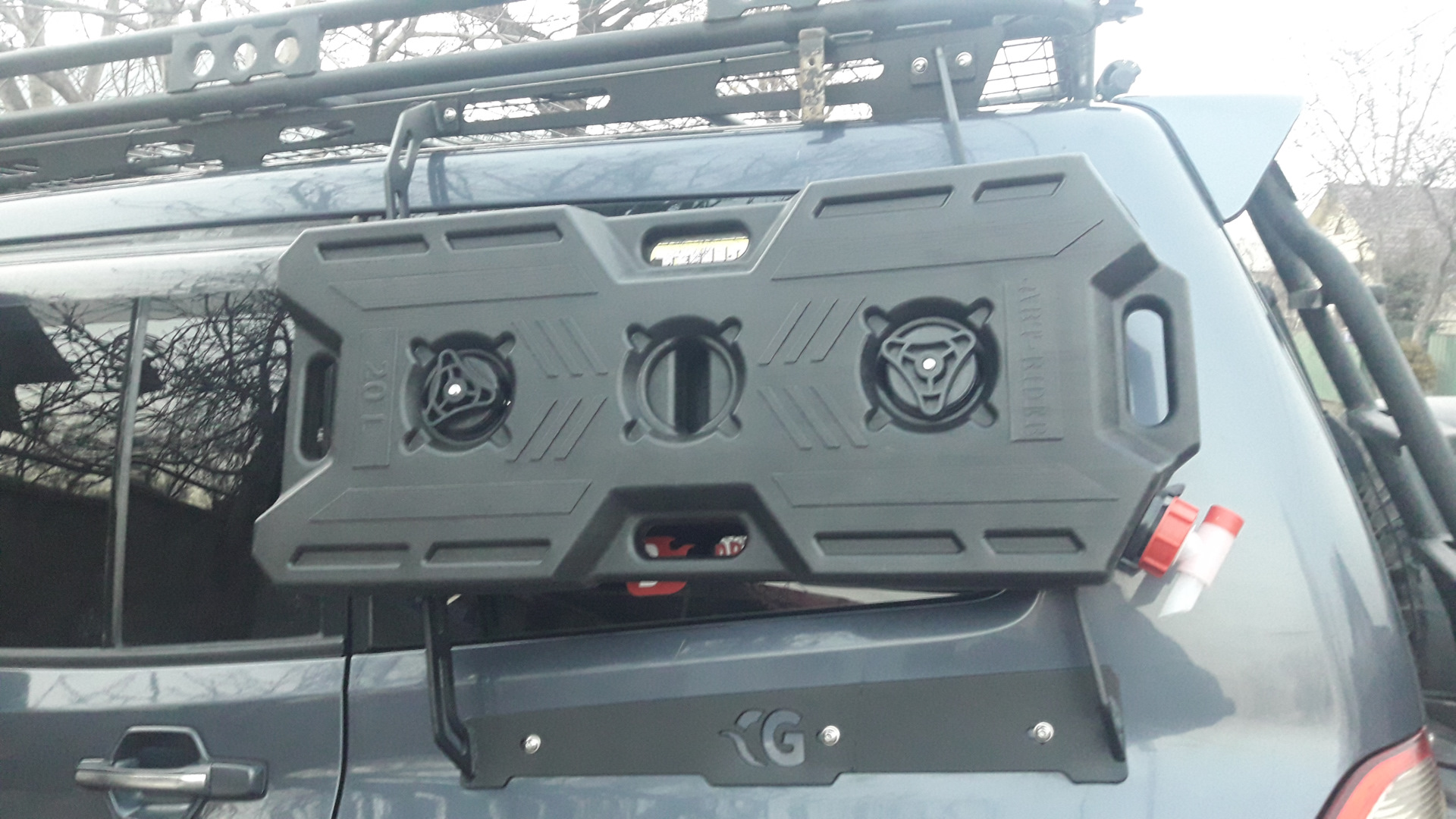 Этот вопрос решил кронштейном под две 20л канистры, запаска снизу