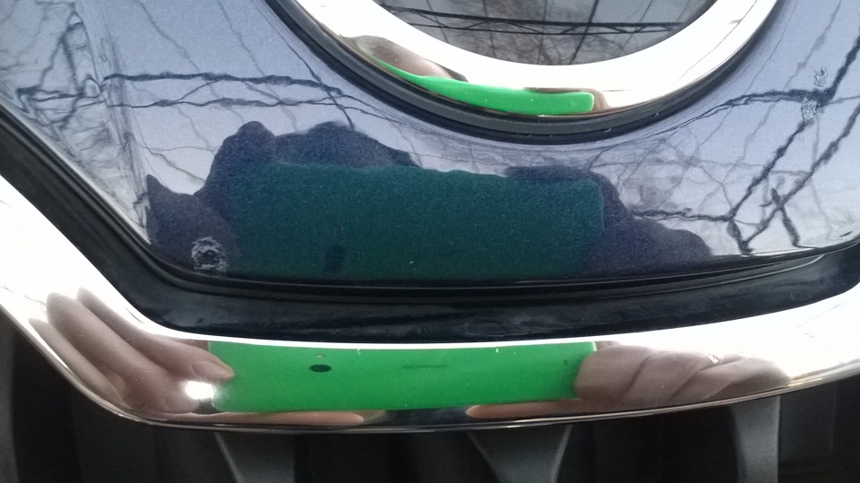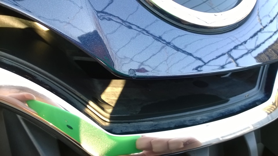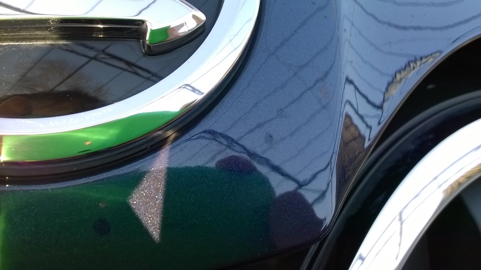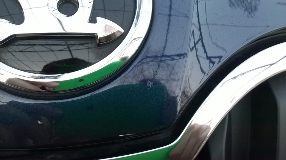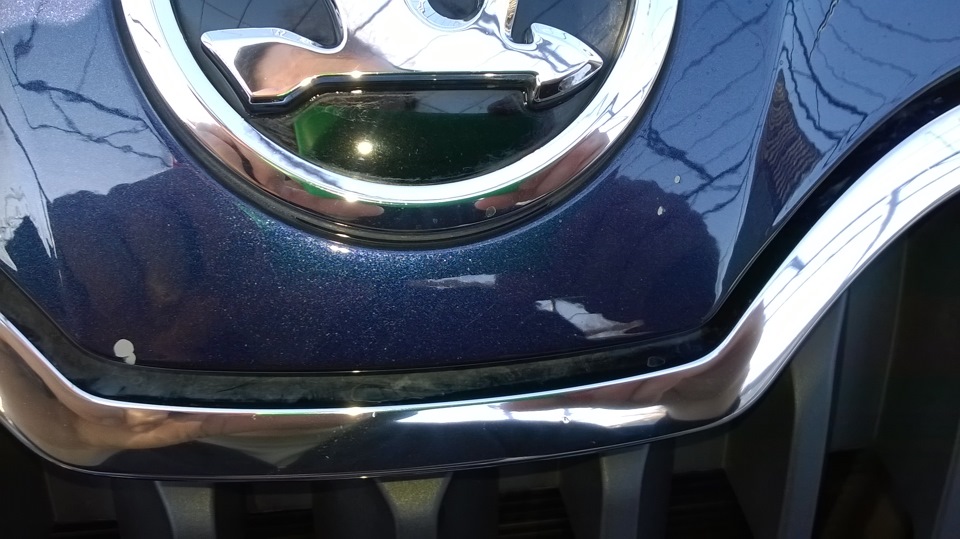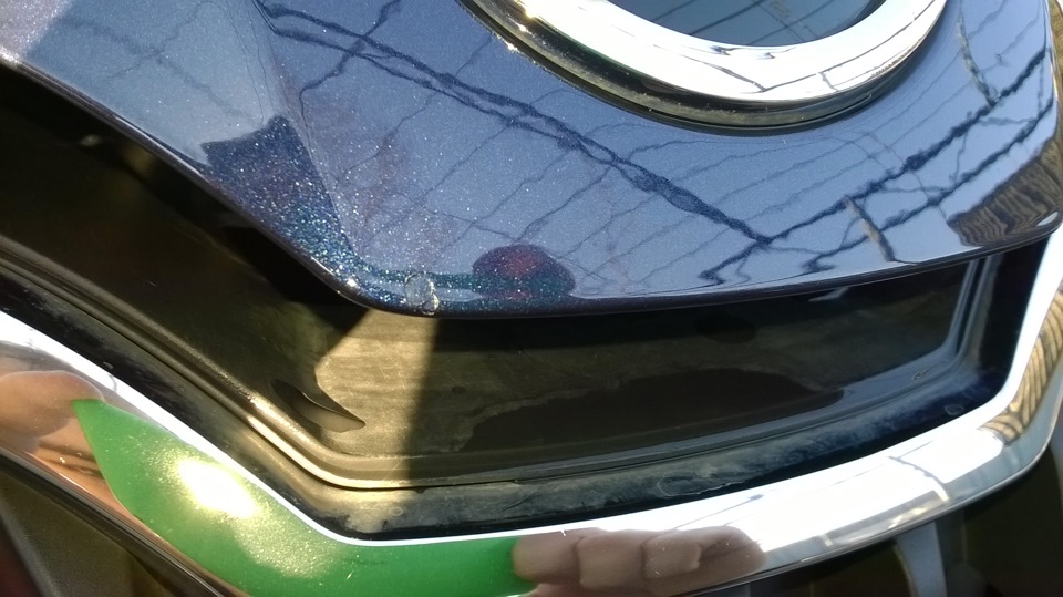 да я так понял, я его и выковырять смогу… Потом по-лучше заделаю. А замазать было надо: на носу — здоровый какой-то, пугающий скол был, а наверху капота — с блестящим металом. Лучше пока с корявой, но защитой поездить, чем без нее и потом уже ржавчину раскалупывать для заделки )))