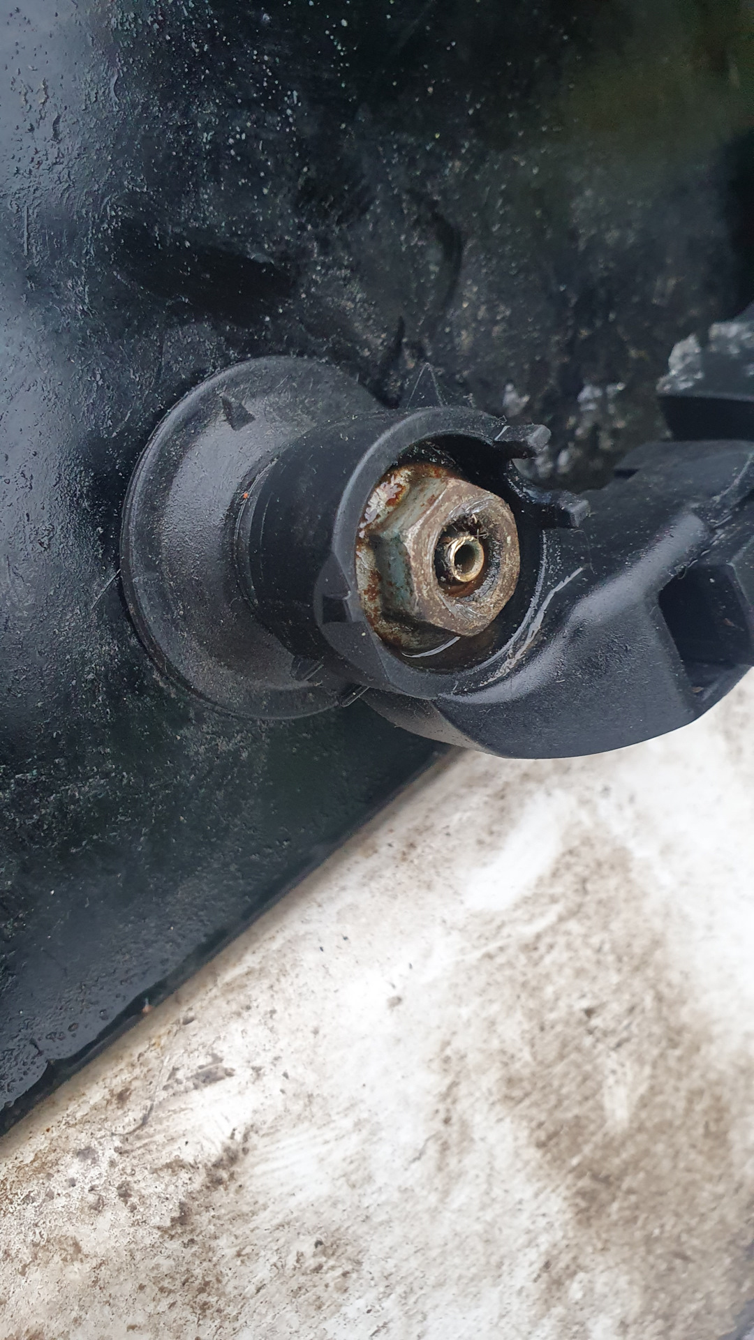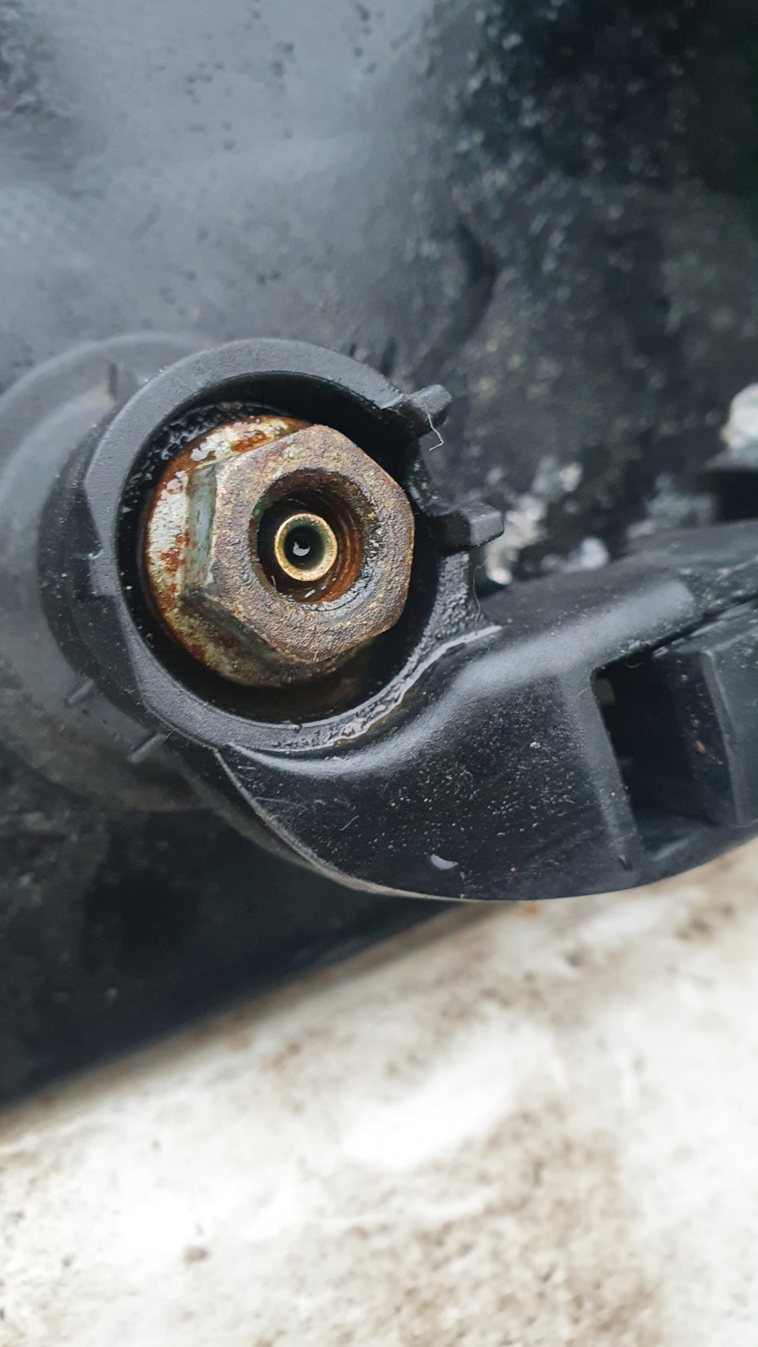 Снимаем крышку родного поводка, поддев ее пластиковой насадкой. Вынимаем форсунку и перед нами гайка на 13. Поливаем WDшкой и откручиваем.