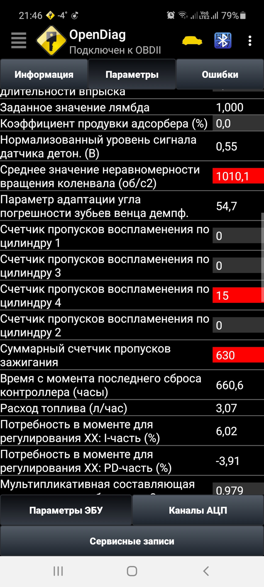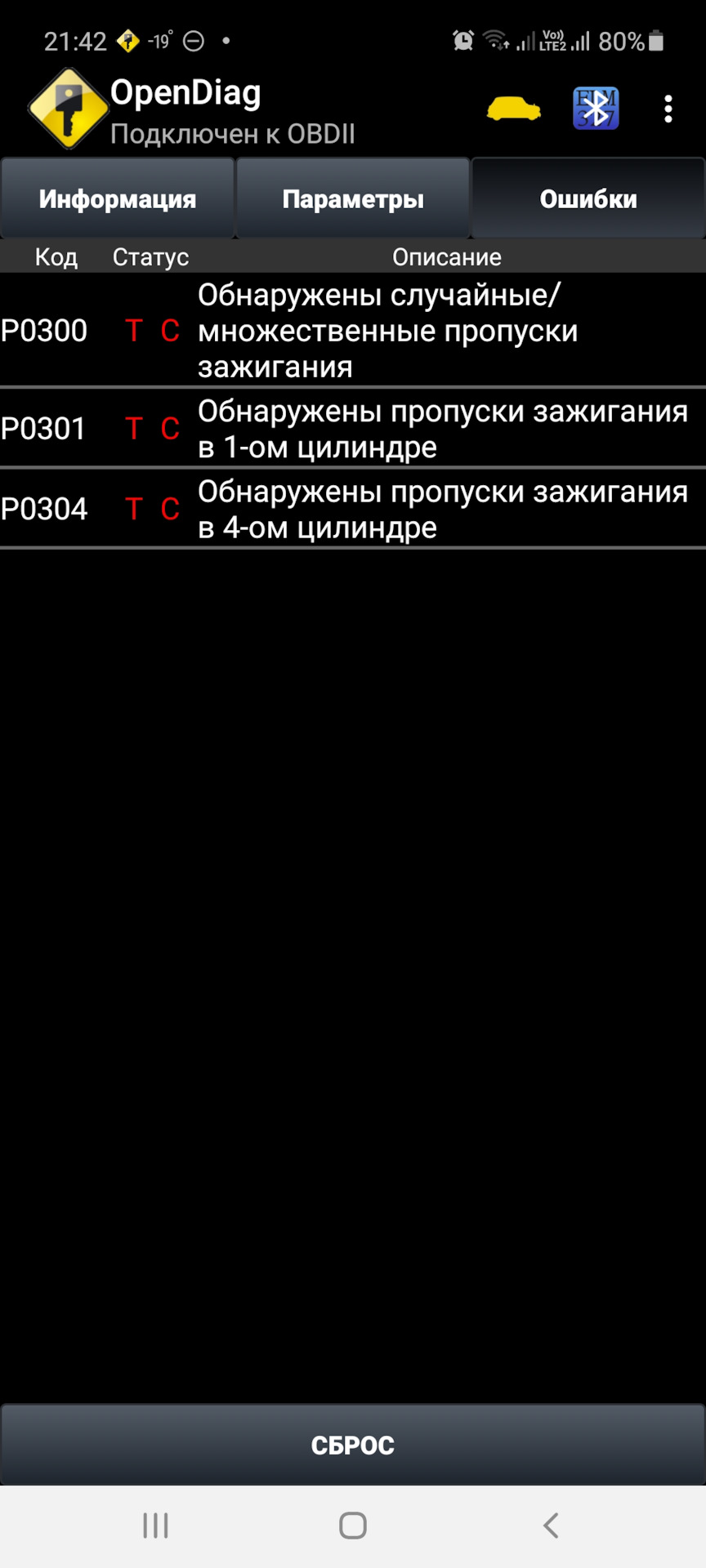 В другой день я вообще не смог запустится сам, крутили меня минуты 2 суммарно и запустился я на паре цилиндров, похоже, т.к. в ошибку ушли сразу и четвертый и первый цилиндры. (С кодами Р0300 — просто множественные пропуски и конкретно по цилиндрам 1 и 4 — Р0301 и Р0304)