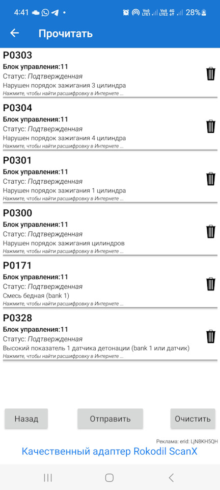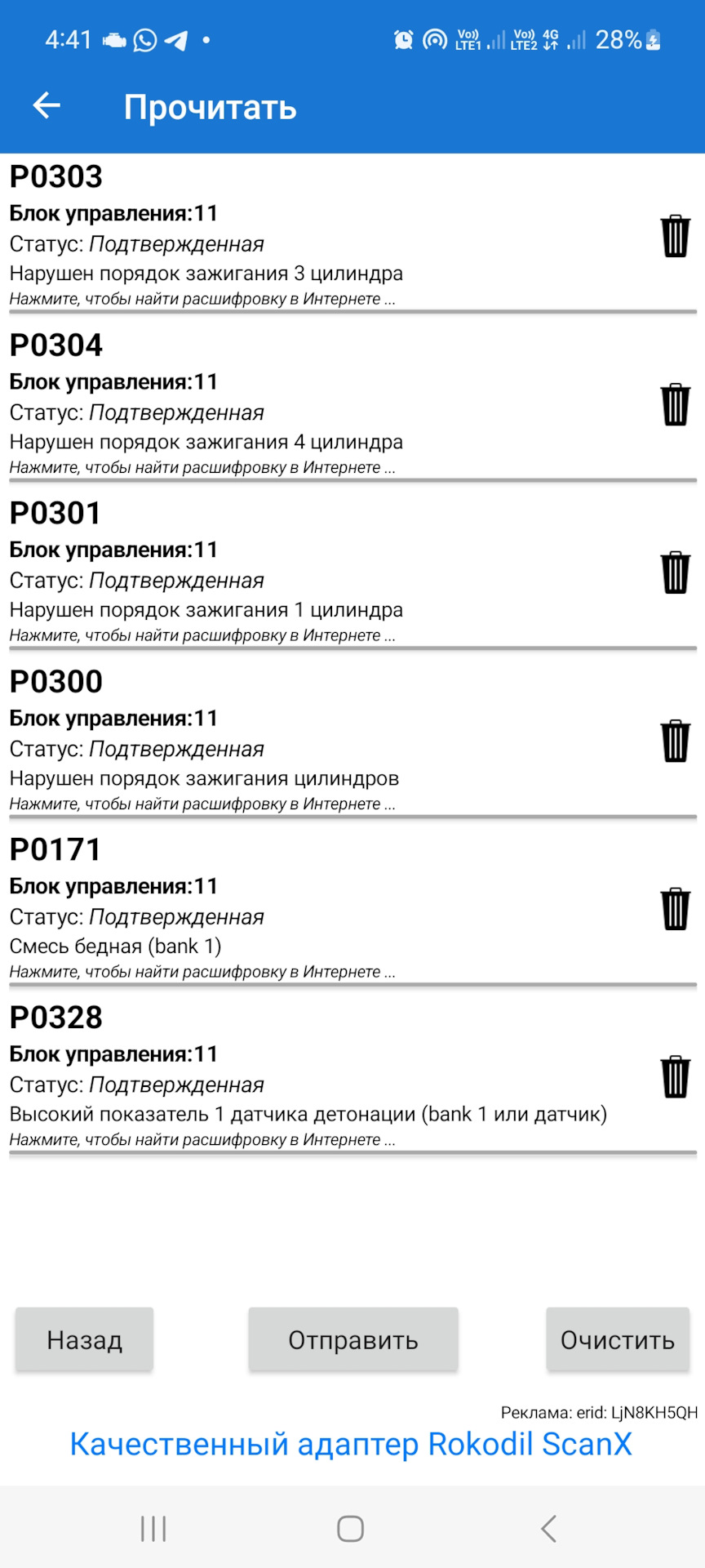 Скинул, ошибку мотор ровно работает. Проехался, опять стал чек моргать. Прочитал ошибки вот, что, выдал .