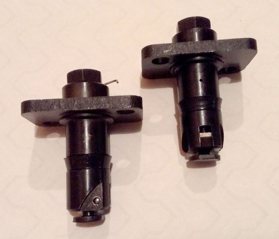 Пружина выталкивает, давится маслом, но обратно не должен, если заходит, значит в мусорку, внутри нарезаны фаски, на торце поршня сидит стопор, фаски нарезаны так, что на выход стопор проскакивает, в обратку не может. Если заходит обратно, либо фаски сточились, либо стопор не годен. Сделано так, для того, чтобы пока натяжитель без масла, (например по утрам), цепь всё же была подпëртая.