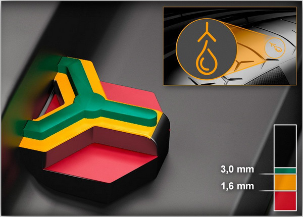 Для информирования водителей об остаточной глубине протектора, был интегрирован новый летний индикатор износа для высокоскоростных шин с тремя величинами глубины:
