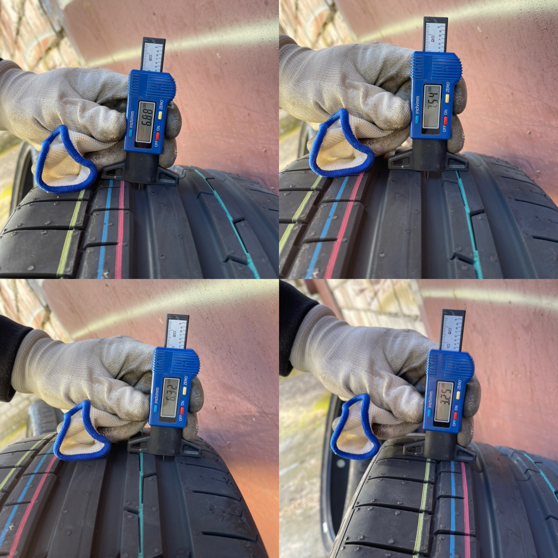 Для тех, кто предпочитает езду на высокой скорости, индикатор должен быть более 3,0 мм. По достижении этой отметки езда на ультра-высокой скорости становится небезопасной. Глубина 1,6 мм минимально допустима для безопасной езды на летней шине. На рисунке видно, как выглядит индикатор износа в реальности, а также, для наглядности, схематично показаны три уровня износа в цвете.
