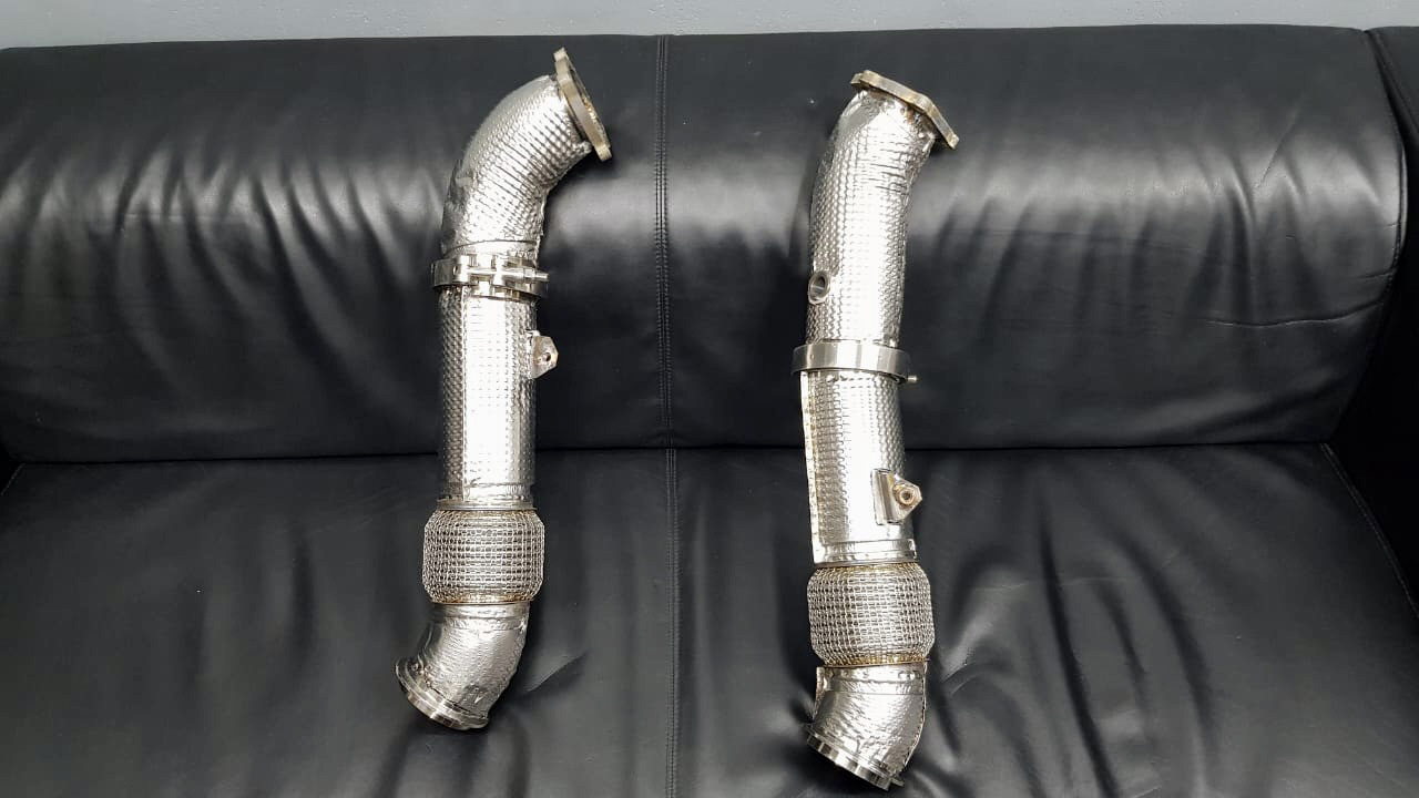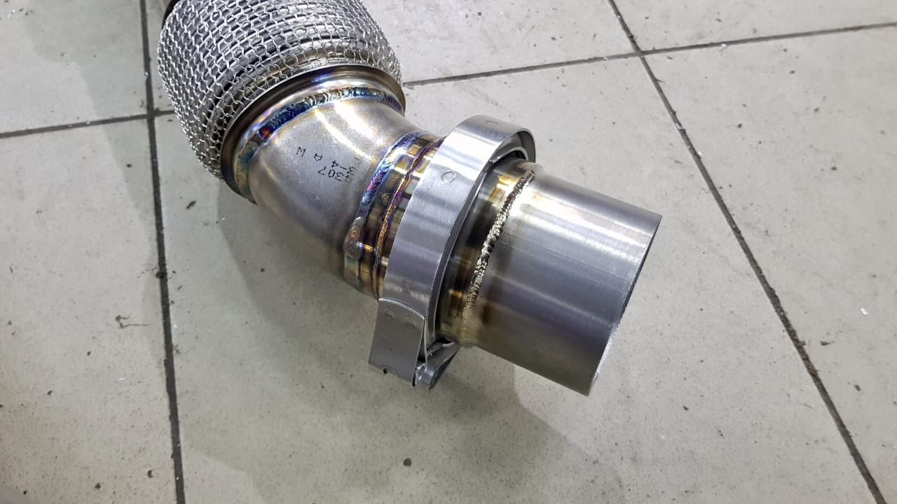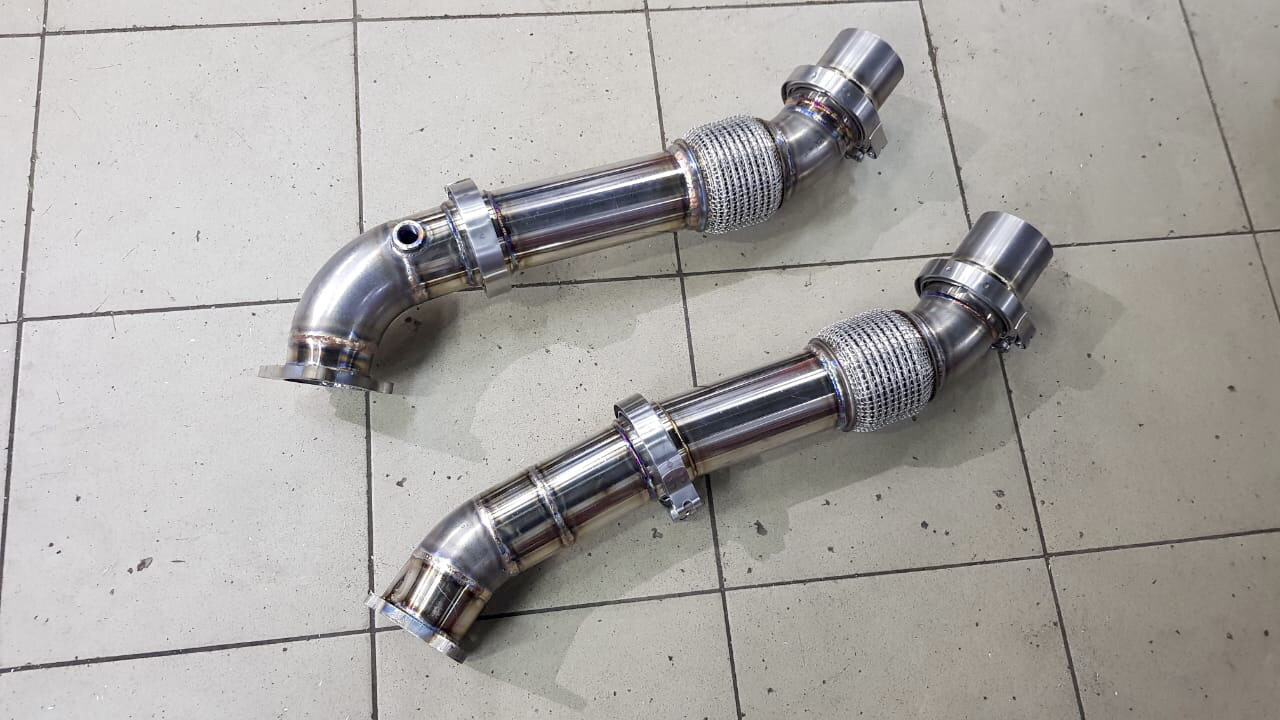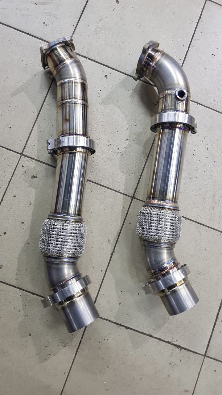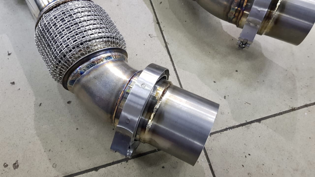 Даунпайпы были изготовлены с небольшим учётом опыта . Сделаны промежуточные соединения v-band для замены датчиков кислорода, гофр(если прогорят ) без съёма двс. Доступ есть где привода .