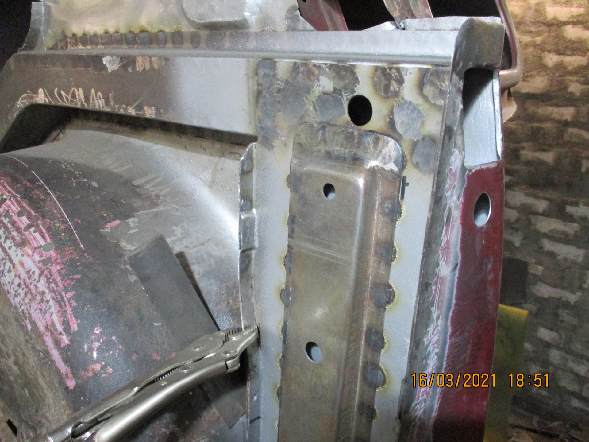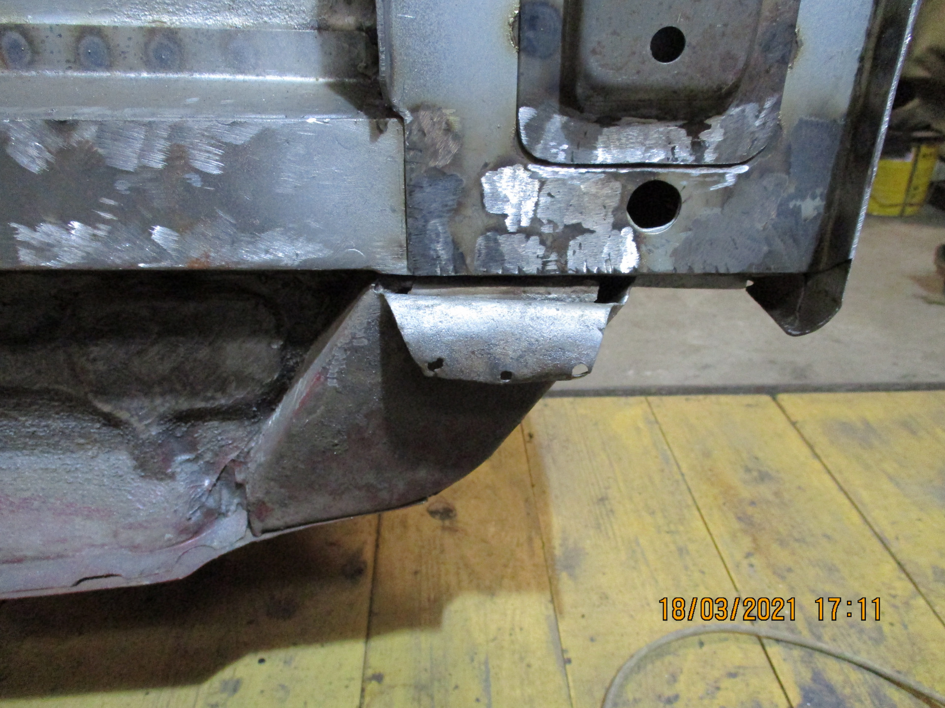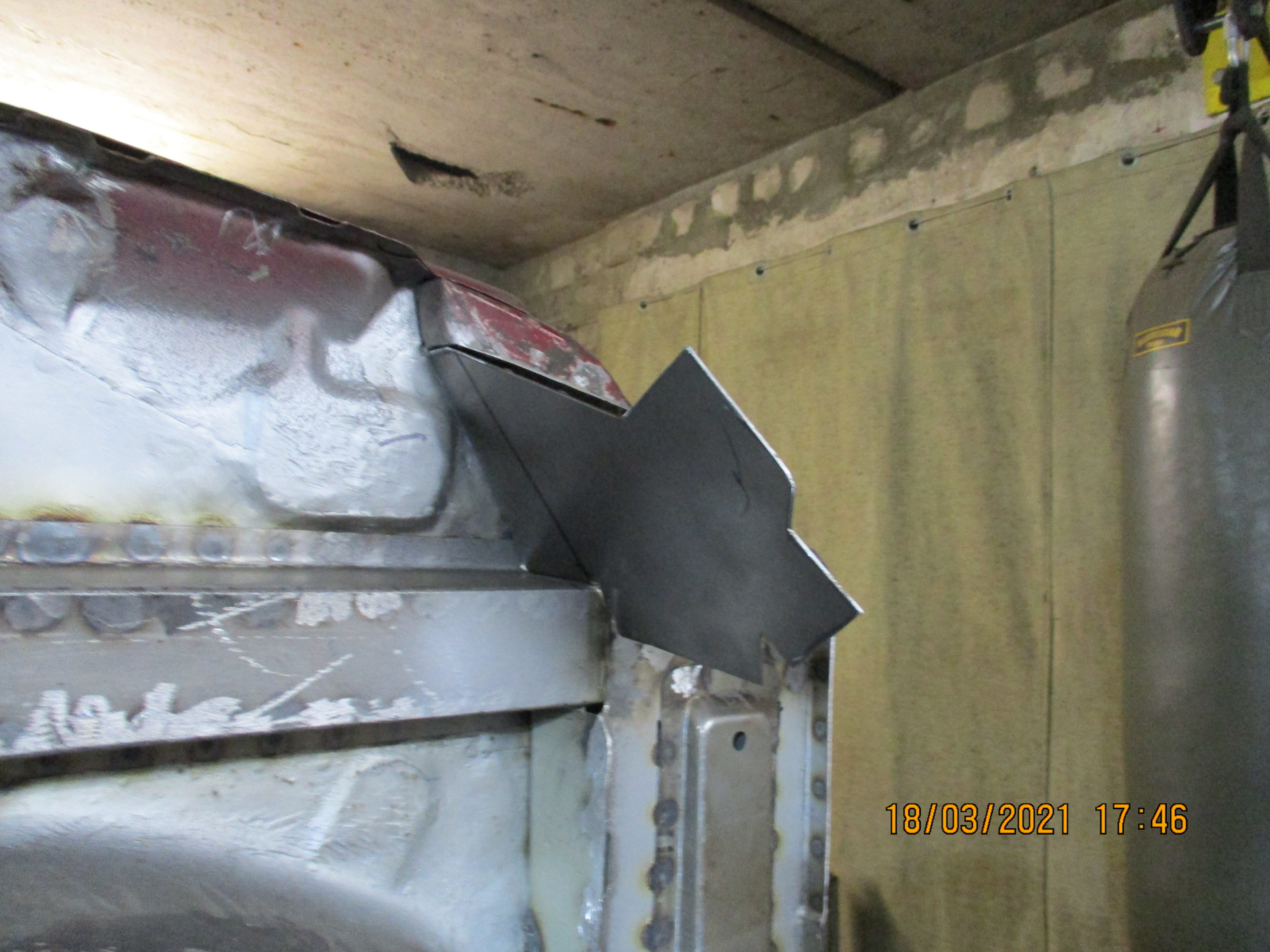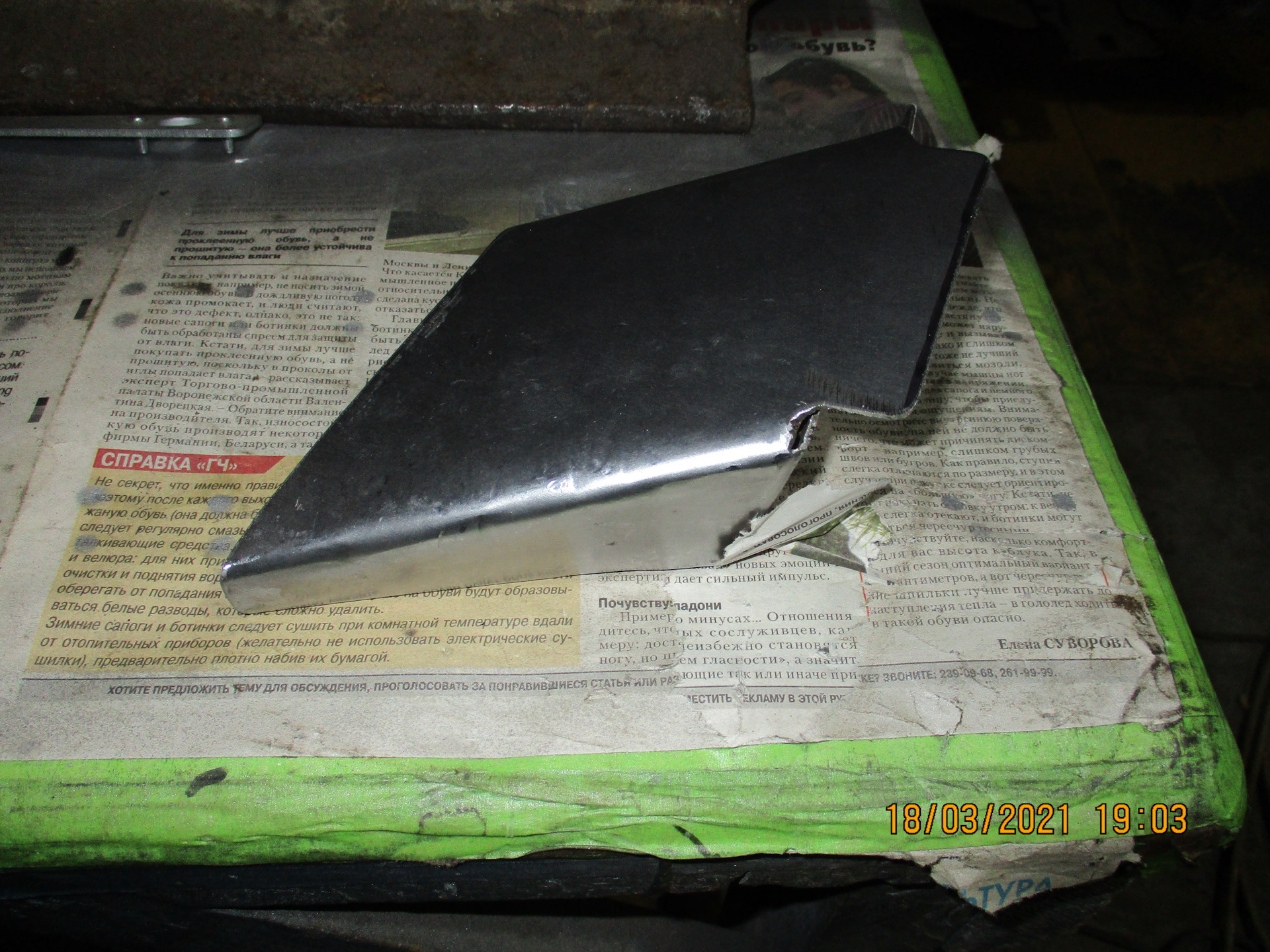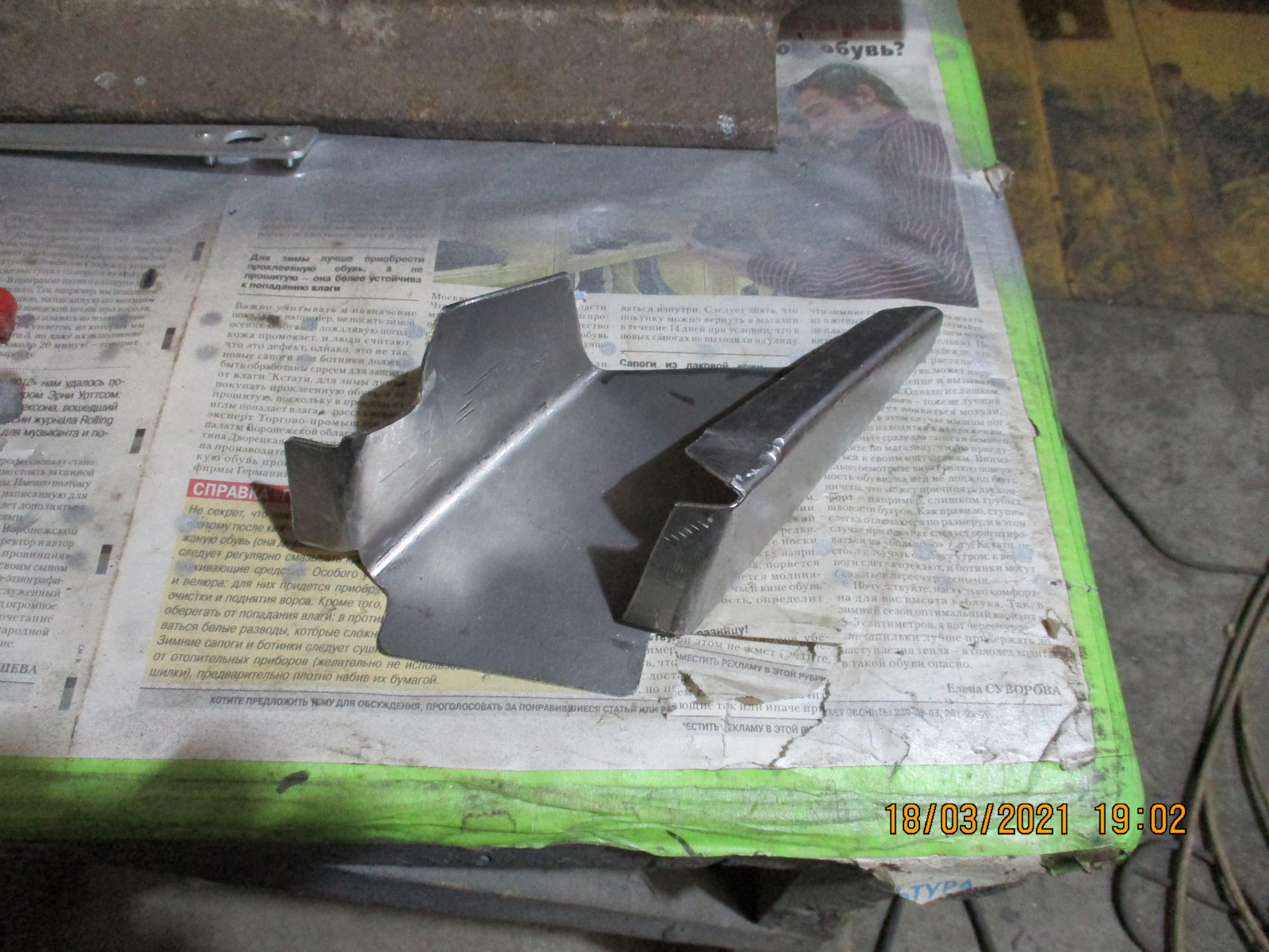 Приварена.Зачищена, но ещё не подрезана.Здесь уже подрезана и приварена, за исключением нескольких точек.Эти точки пришлось варить к поеденной коррозией железяке и я подложил под неё медную пластину-бандаж, чтобы не прожечь.Эти тоже к ржавенькой варить.Была щелка.Подтянута и приварена. Тоже через бандаж.Всё подзачищено.Тут красиво.И тут красиво.Новая силовая часть зада моей машины почти готова.Теперь нужно вот этот уголок сваять.С этой стороны более-менее цело.Должно получиться как-то так.Внутри тоже усилитель. Как его сделать я уже придумал.Сделал выкройку и вырезал кусочек примерно.Начал примерять…В результате получилась вот такая гнутая железяка.С другой стороны.Вот так подходит к месту.В процессе сварки подтянется.
