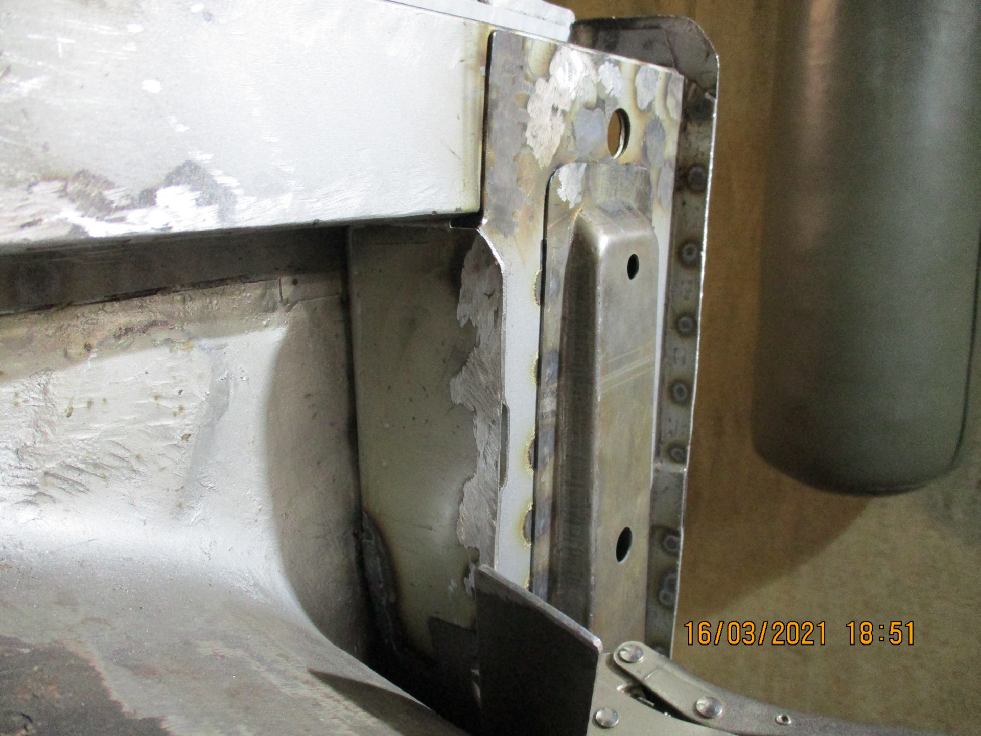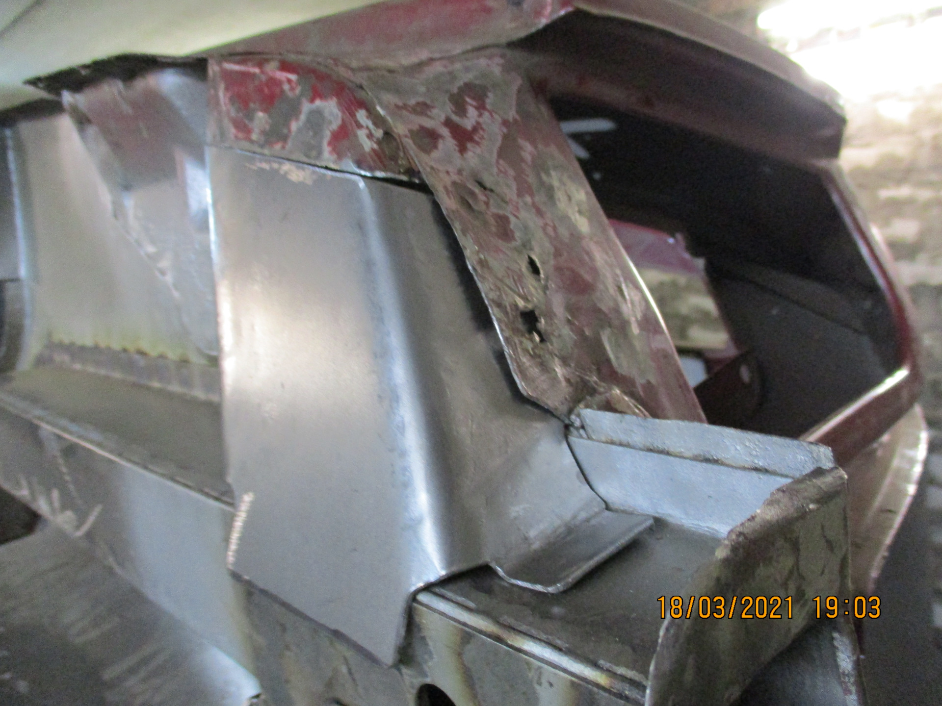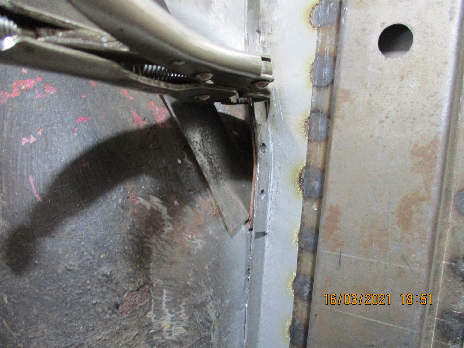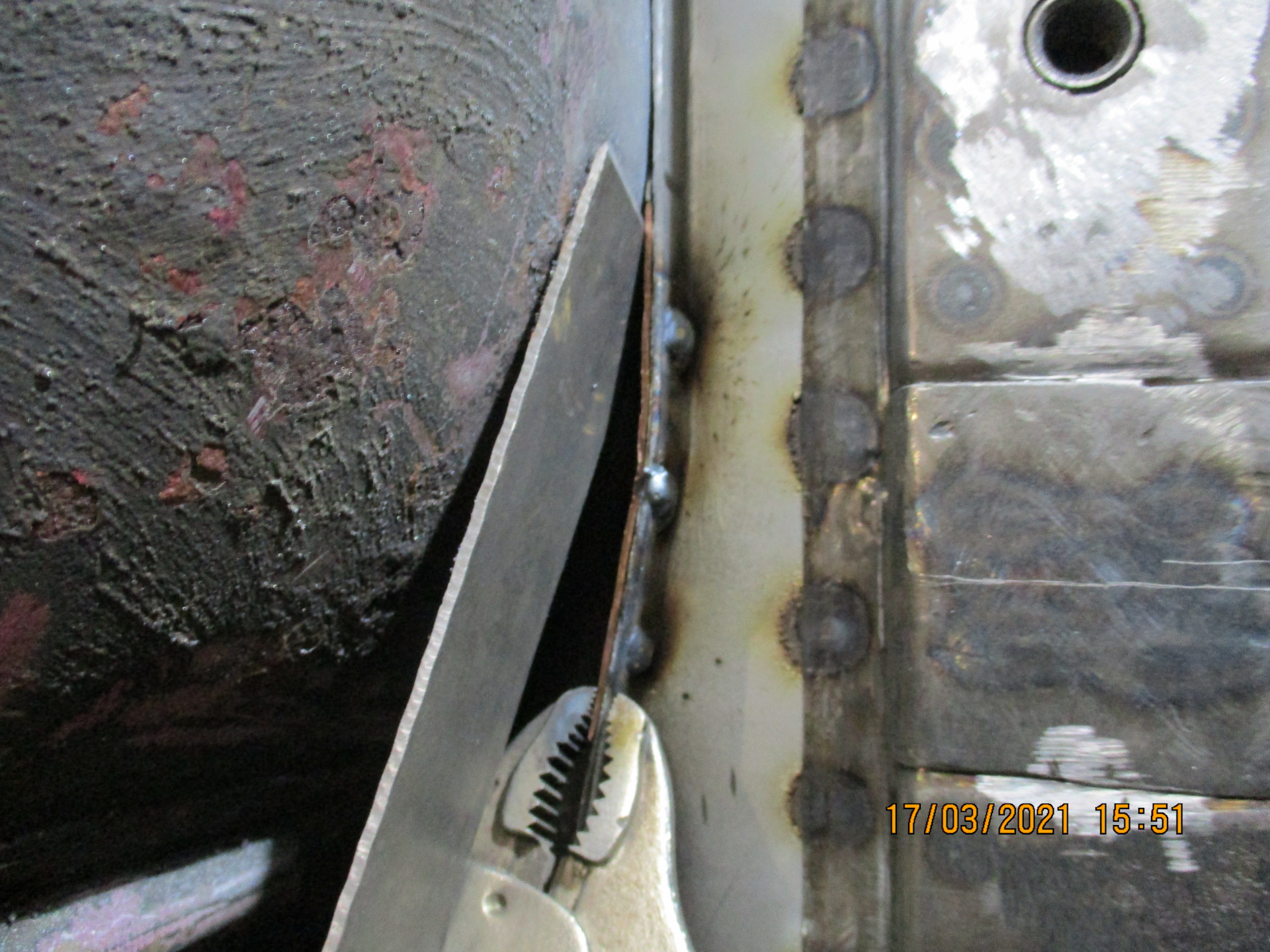 Приварена.Зачищена, но ещё не подрезана.Здесь уже подрезана и приварена, за исключением нескольких точек.Эти точки пришлось варить к поеденной коррозией железяке и я подложил под неё медную пластину-бандаж, чтобы не прожечь.Эти тоже к ржавенькой варить.Была щелка.Подтянута и приварена. Тоже через бандаж.Всё подзачищено.Тут красиво.И тут красиво.Новая силовая часть зада моей машины почти готова.Теперь нужно вот этот уголок сваять.С этой стороны более-менее цело.Должно получиться как-то так.Внутри тоже усилитель. Как его сделать я уже придумал.Сделал выкройку и вырезал кусочек примерно.Начал примерять…В результате получилась вот такая гнутая железяка.С другой стороны.Вот так подходит к месту.В процессе сварки подтянется.