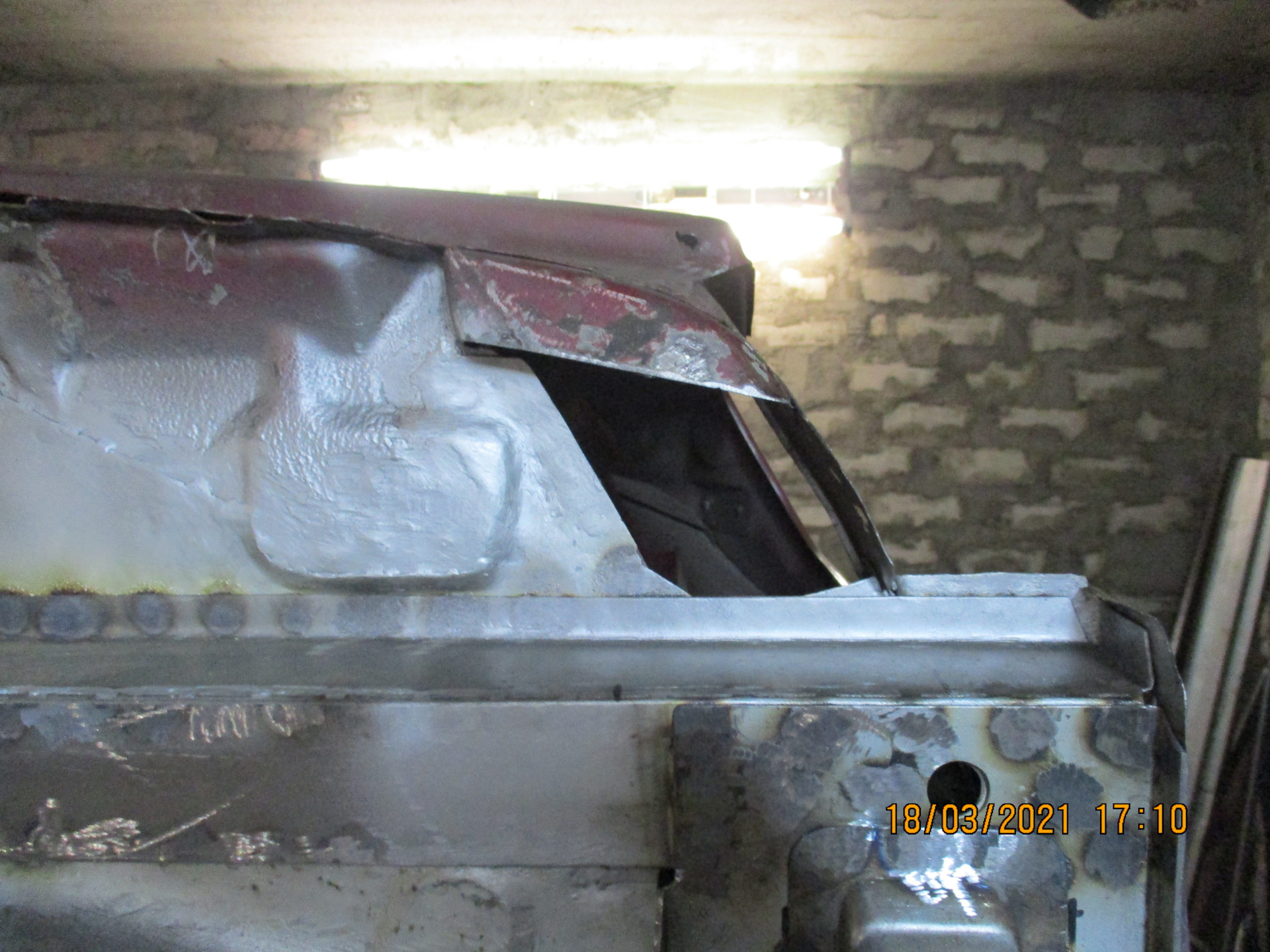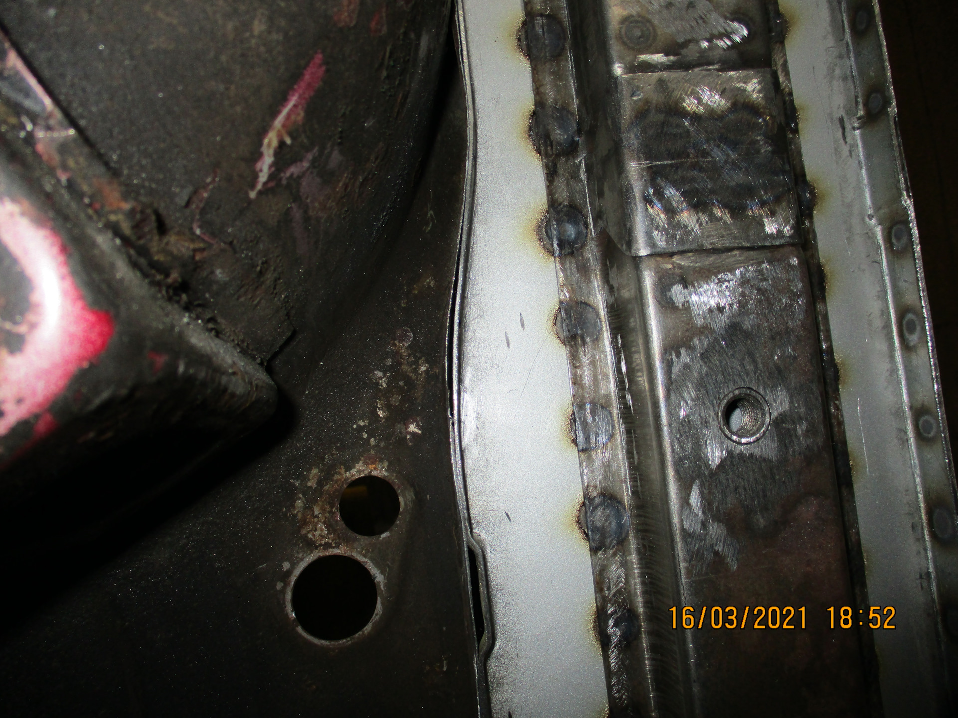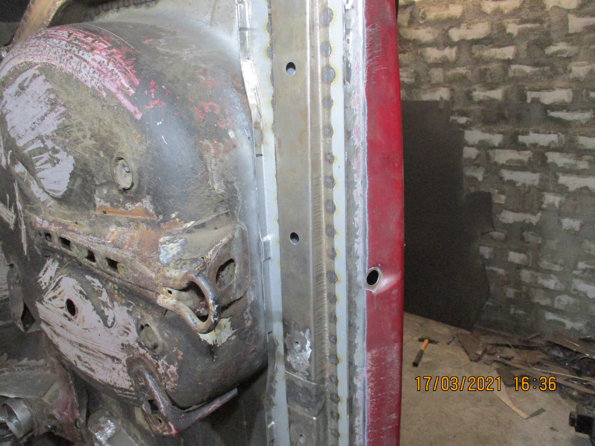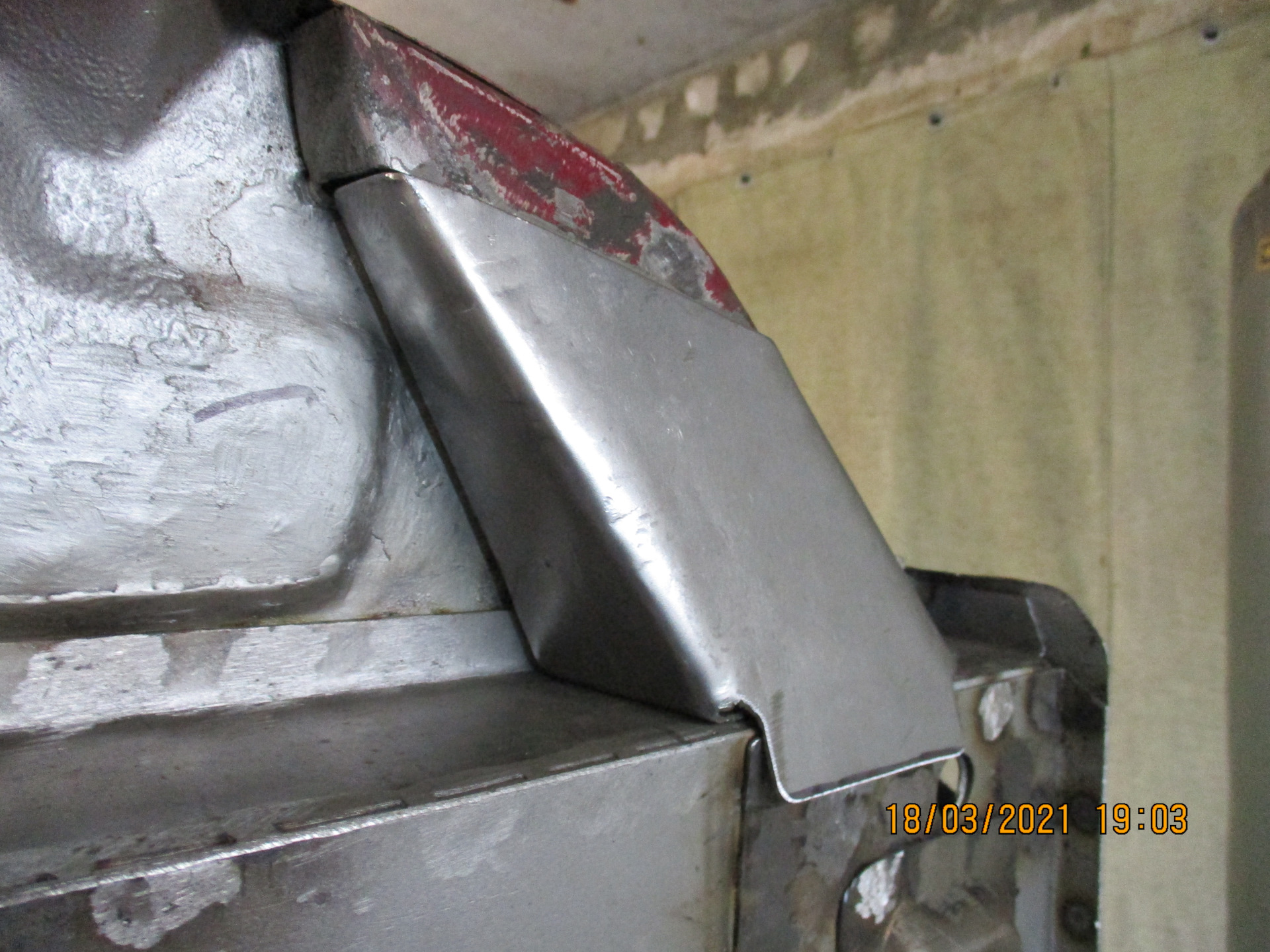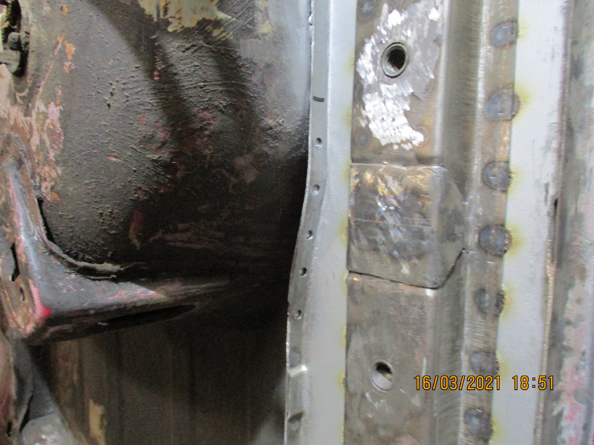 Приварена.Зачищена, но ещё не подрезана.Здесь уже подрезана и приварена, за исключением нескольких точек.Эти точки пришлось варить к поеденной коррозией железяке и я подложил под неё медную пластину-бандаж, чтобы не прожечь.Эти тоже к ржавенькой варить.Была щелка.Подтянута и приварена. Тоже через бандаж.Всё подзачищено.Тут красиво.И тут красиво.Новая силовая часть зада моей машины почти готова.Теперь нужно вот этот уголок сваять.С этой стороны более-менее цело.Должно получиться как-то так.Внутри тоже усилитель. Как его сделать я уже придумал.Сделал выкройку и вырезал кусочек примерно.Начал примерять…В результате получилась вот такая гнутая железяка.С другой стороны.Вот так подходит к месту.В процессе сварки подтянется.