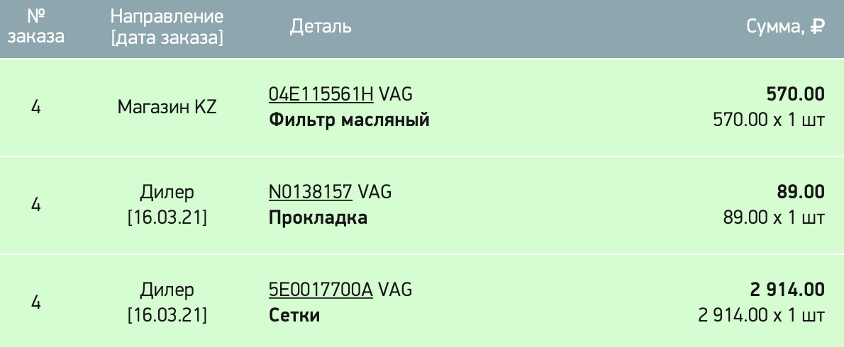 Для сервисных работ заранее закупился расходниками в автодоке (фильтр 04E115561H VAG, прокладка пробки N0138157 VAG) + решил порадовать себя оригинальной сеткой для багажника 5E0017700A VAG.
