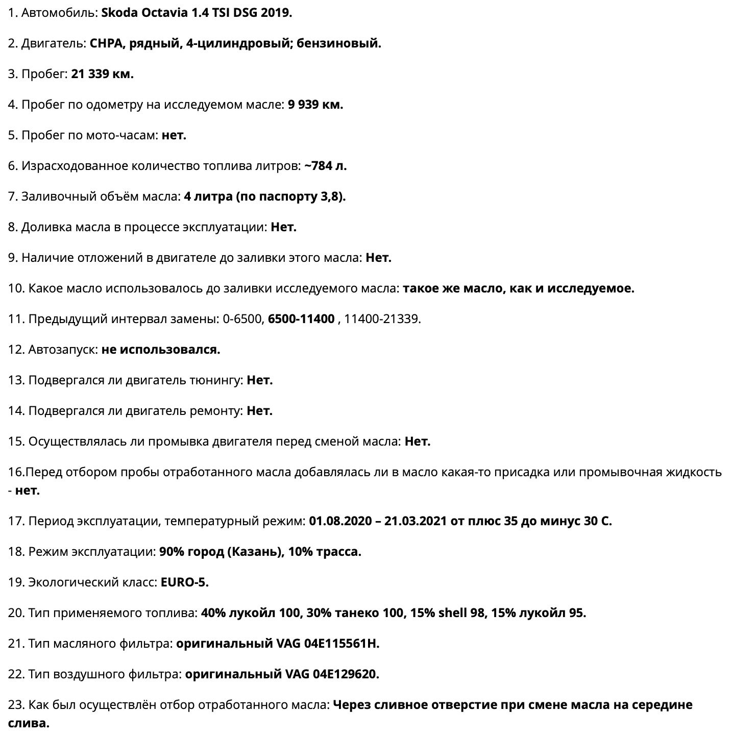 Отработку масла отправлю в лабораторию уже завтра. Полученные результаты опубликую отдельным постом в бортжурнале. Будет интересно узнать фактический ресурс ПАО масла при езде в тяжелых условиях города (пробки, старт-стоп), ну и влияние топлива, где у меня в основном 100-й лука и танеко.