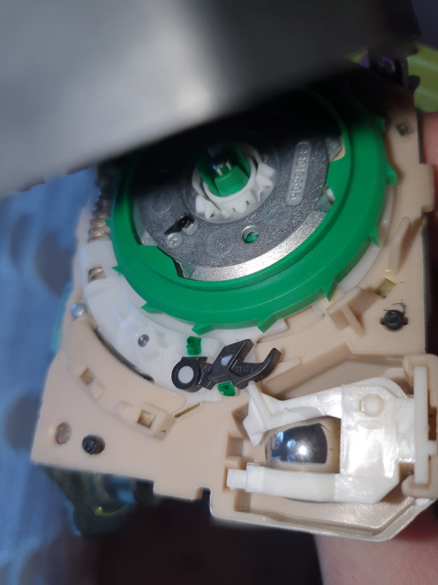 Шарик это гавитационный стопор — размотать ремень и накручивать втулку можно, если держать блок в правильном положении. Или можно снять крышку и отжать стопор.