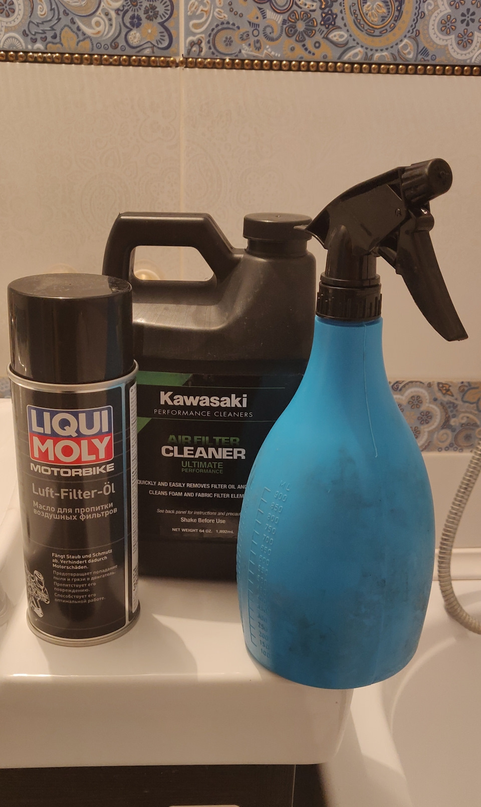Я пользуюсь средством для смыва: [K61021-505] KAWASAKI Performance Cleaners Air Filter Cleaner (1,89л), а пропитка [1625] Motorbike Luft-Filter-Oil 0,5л