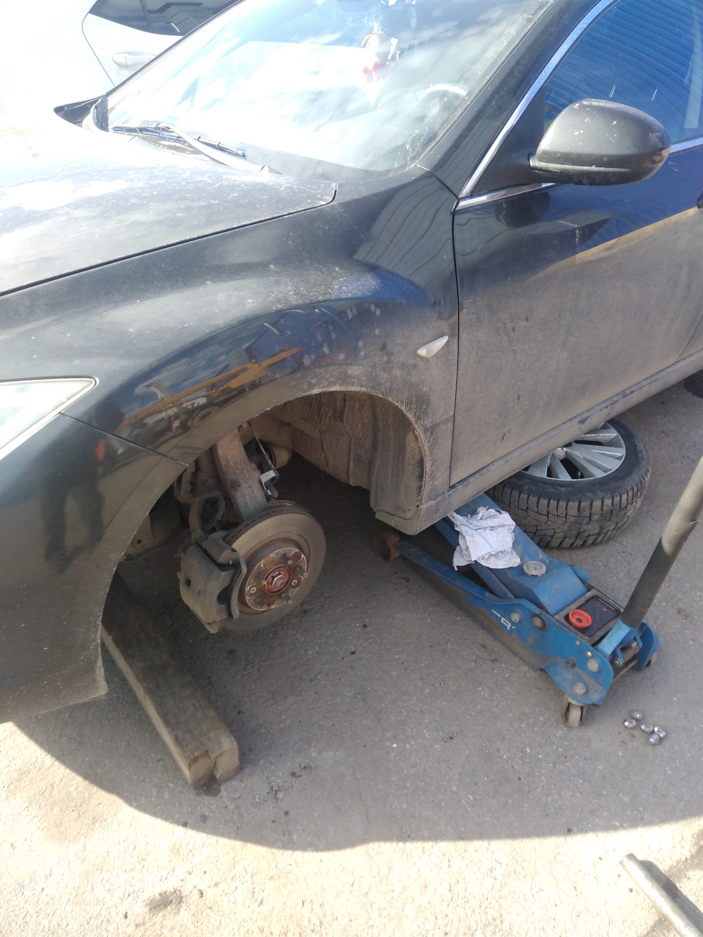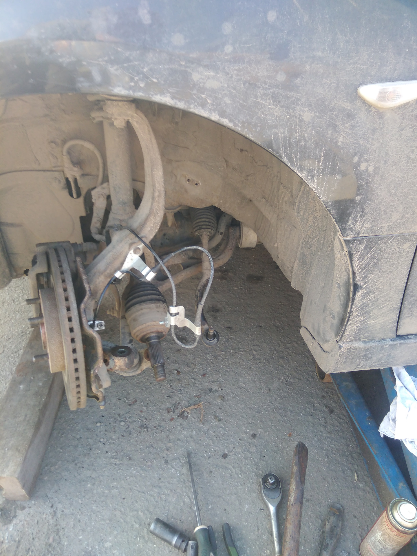 Снял поворотный кулак, открутив нижнюю шаровую, рулевой наконечник и ступичную гайку и развернул его поперек машины.