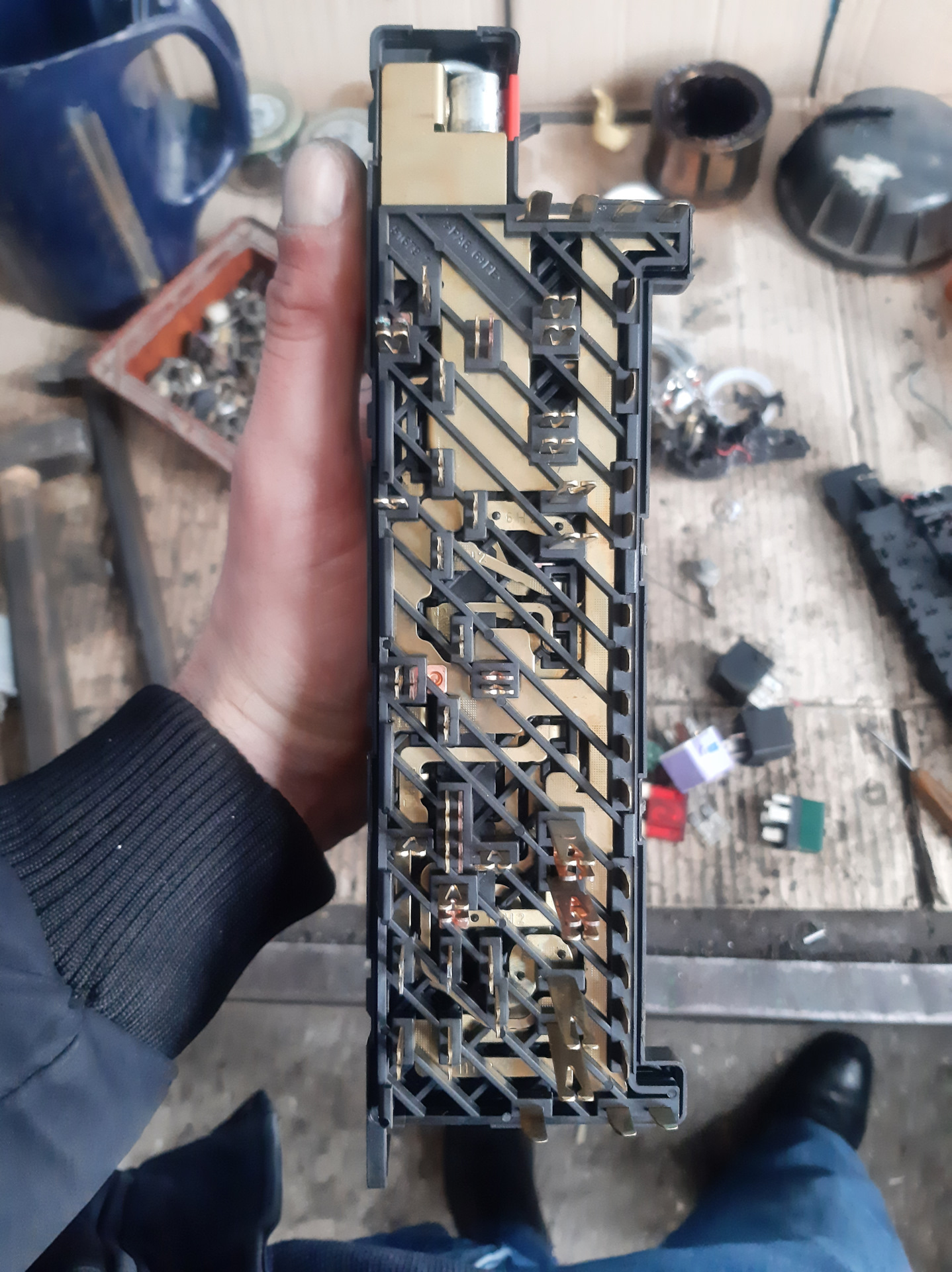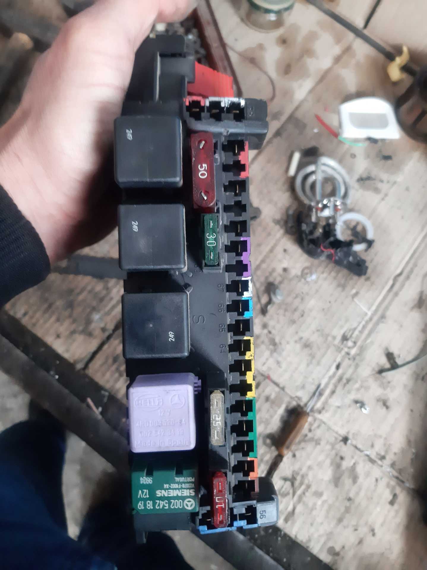 Вот он уже на операционном столе! Выжергиваем реле и предохранители, и по бокам отщёлкиваем защёлки мелкой отвёрточкой, не сфоткал но там всё понятно! Снимаем окуратно верхнюю крышку!