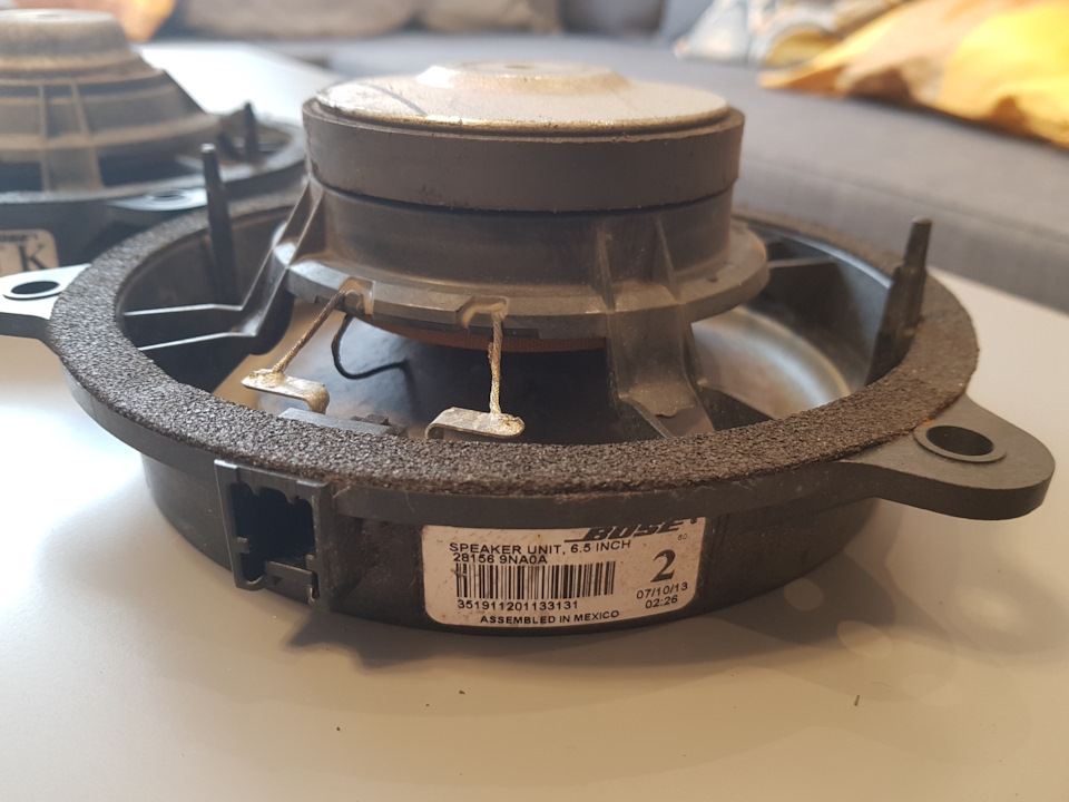 Заменил штатные BOSE 28156JY10A на BOSE от Nissan 281569NA0A. У последних магнит крупнее, и я думал придётся колхозить проставки. Но, на моём Koleos 2008 года в версии BOSE для Европы динамики крепятся прямо на железо. Пластиковая накладка меньше, никакой профилированной корзины под динамики нет. В этом для меня плюс, но для звука и сохранности динамика, конечно, минус. Но, цель была не улучшить звук, а вернуть как минимум прежний. Думаю, эти с большими магнитами и побасовитей будут, хотя мне и тех басов хватало при уровне НЧ посередине. Причина замены старых — хрипы и в конце концов пропажа звука. Они под магнитом корродируют от влаги, попадающей в дверь, возникает деформация, перекос и диффузор клинит. Б/у в Евроавто 28156JY10A с такой же коррозией. Да их, колеосных, и меньше. Ниссановских выбор больше, они поновее, посвежее.