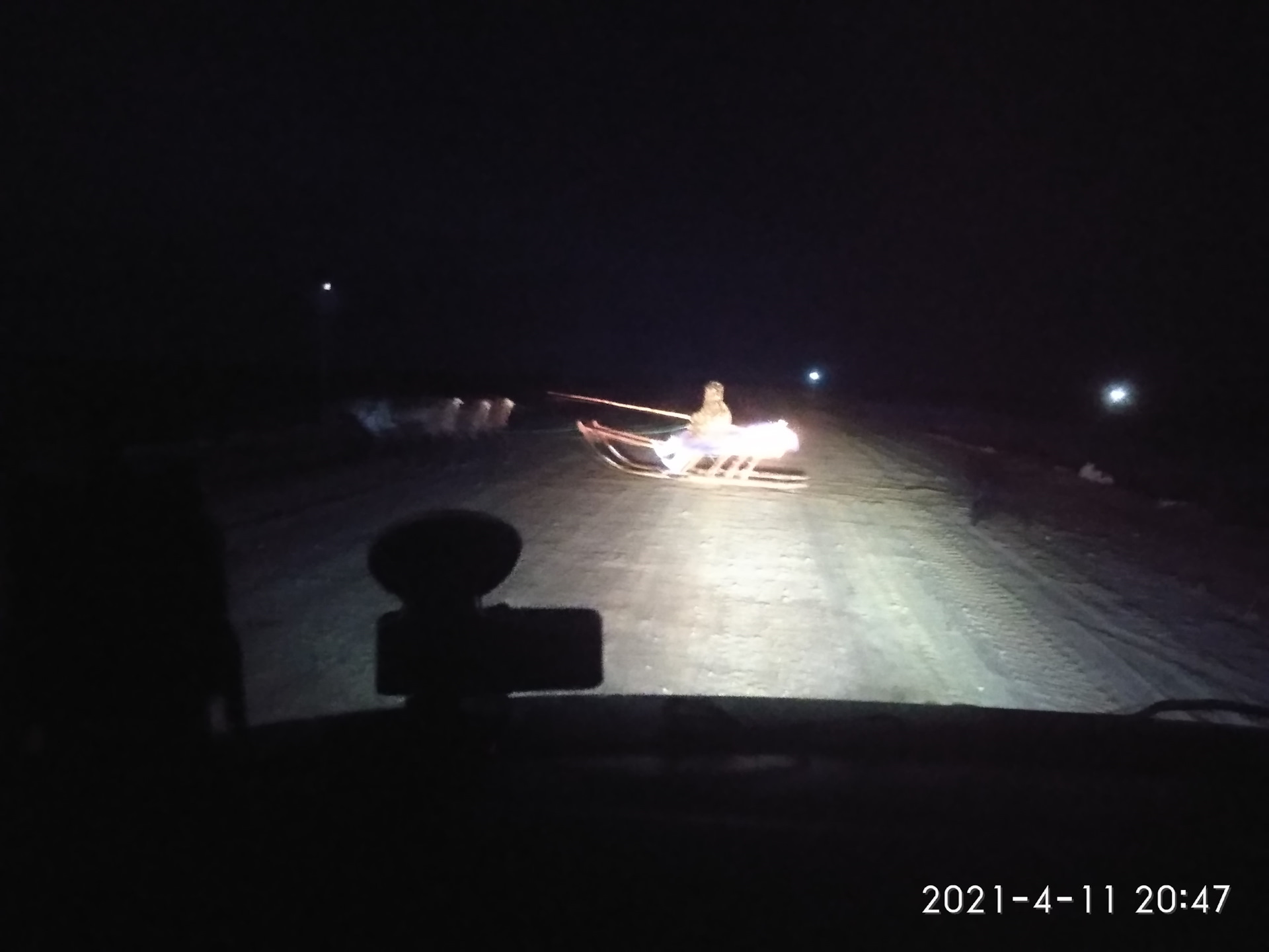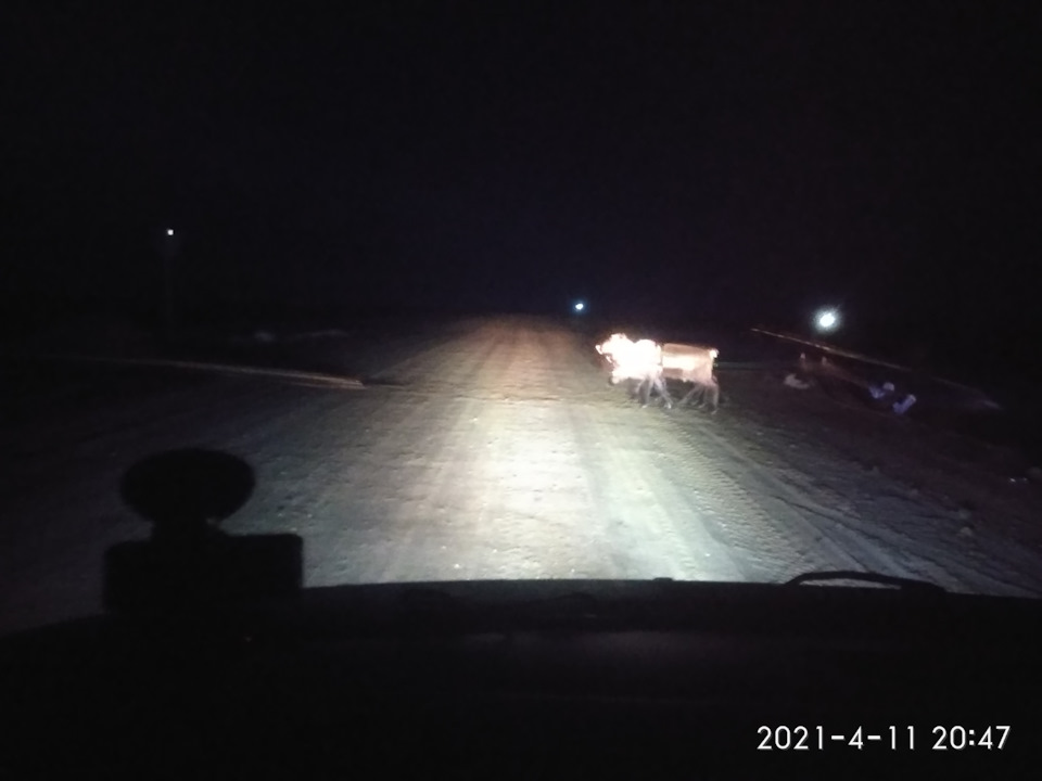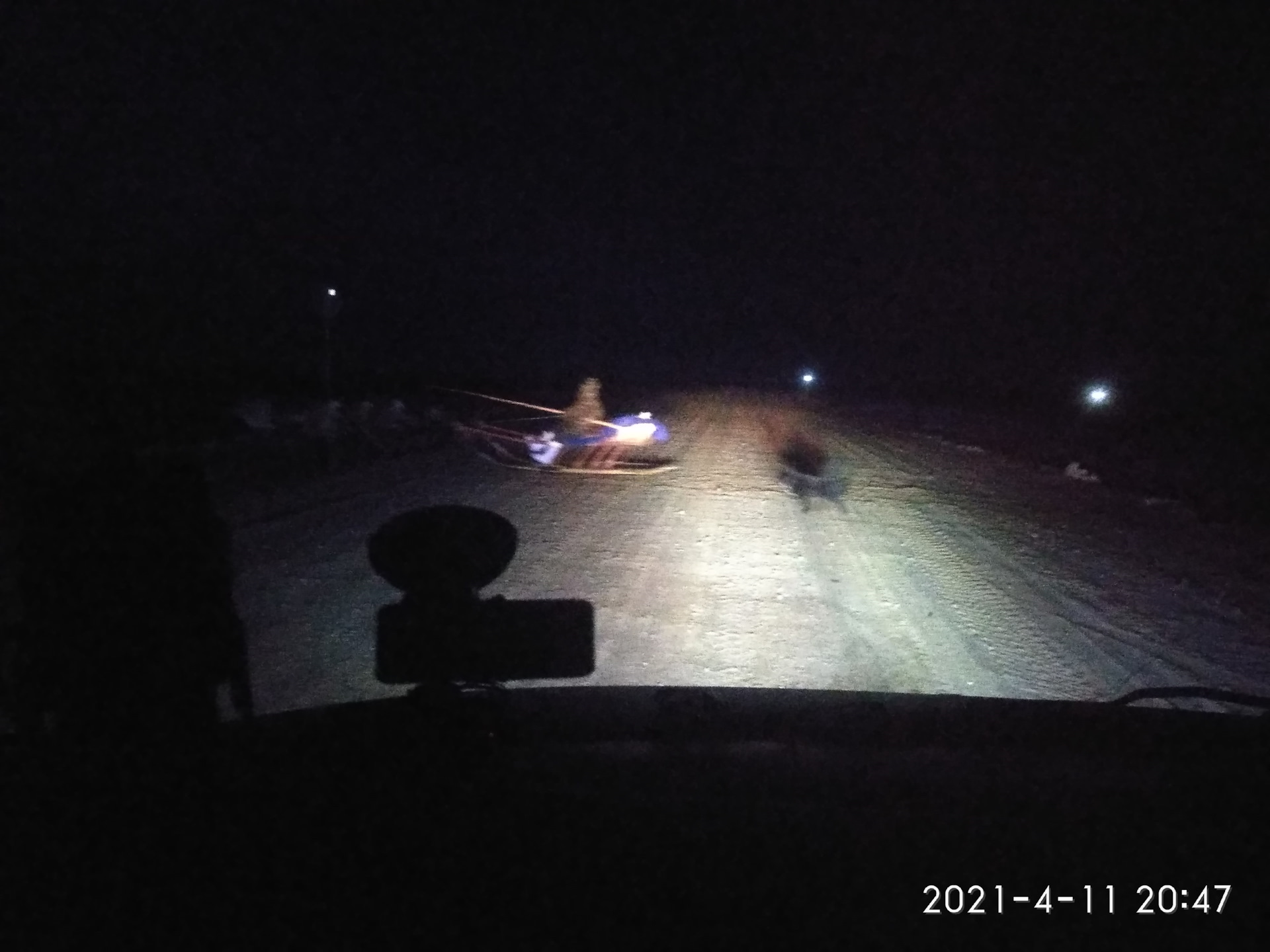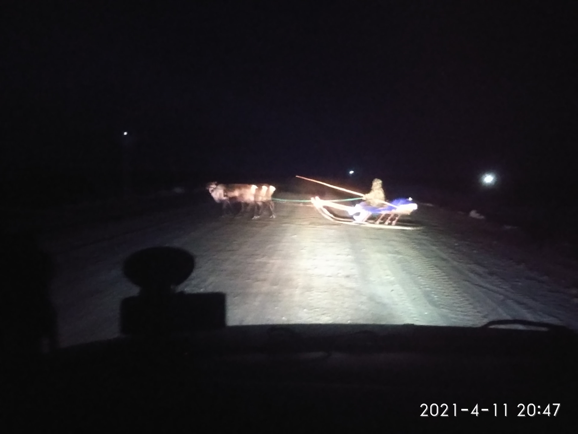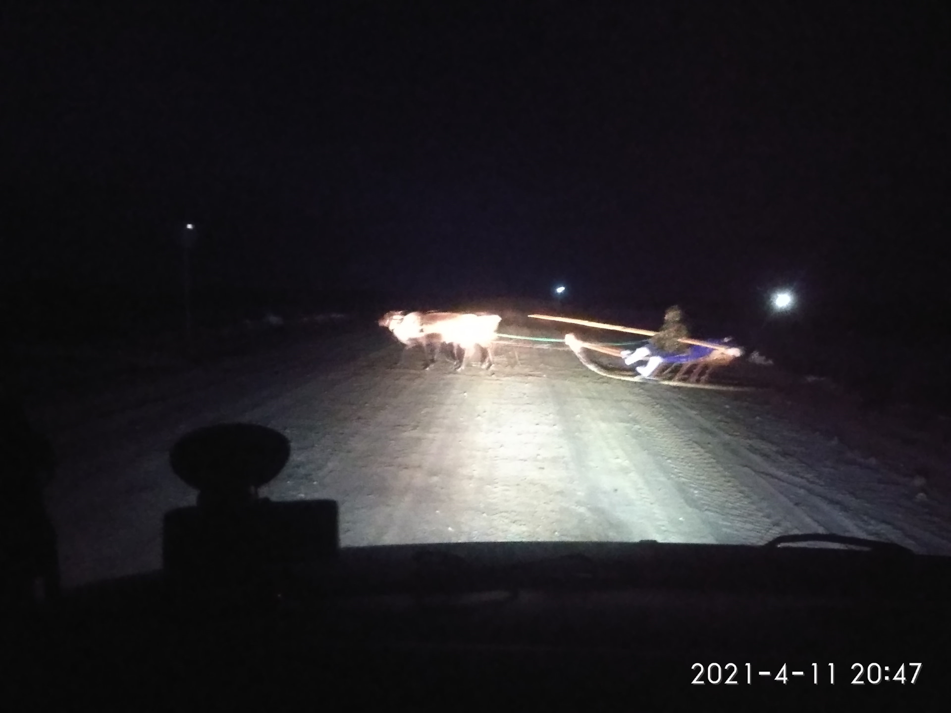 Пару-тройка олених упряжек в темноте, выскочили с тундры и пересекли проезжую часть
