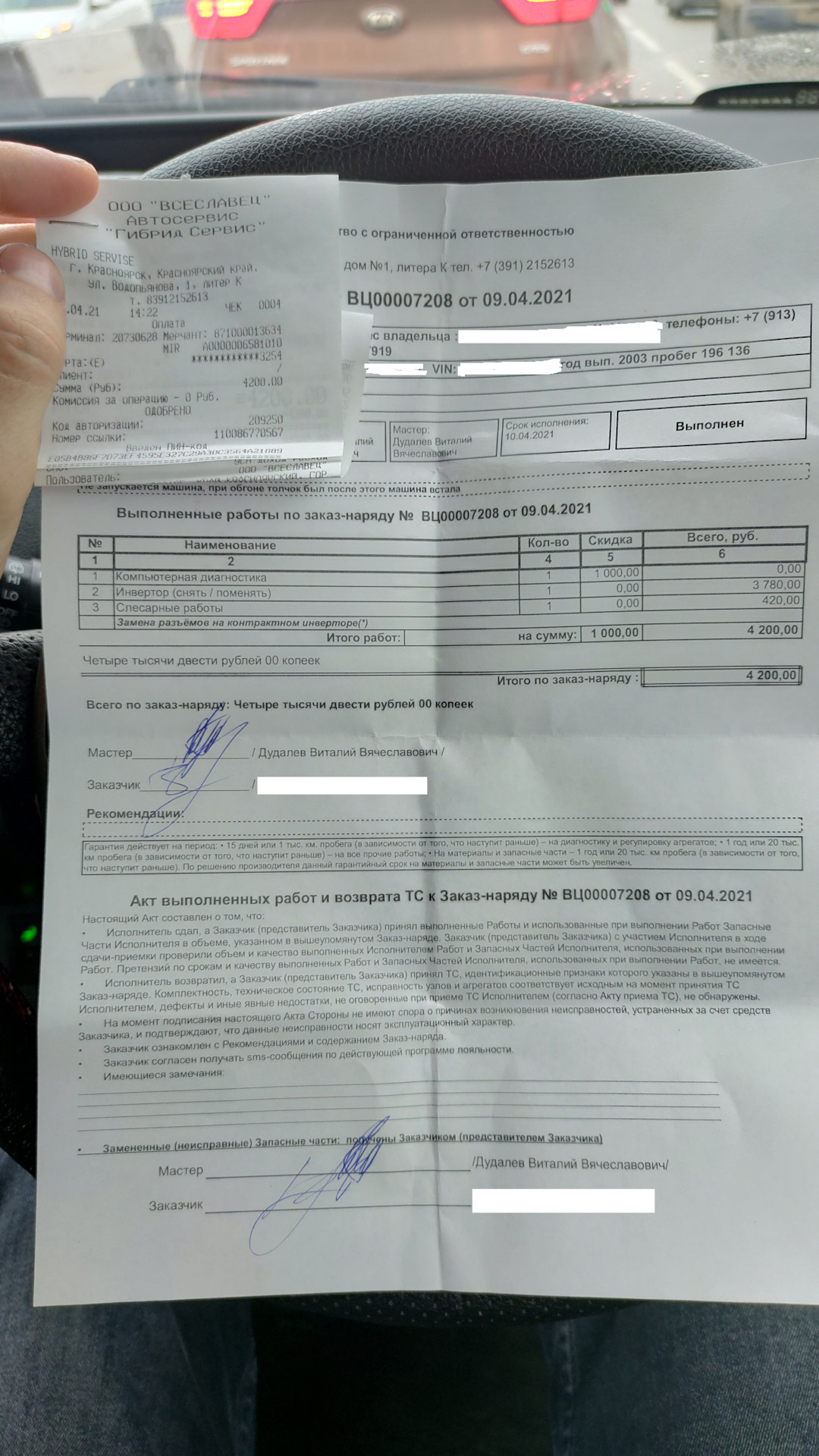 Пятница, мой выходной, катаюсь по своим делам. Трогаюсь со светофора, набираю скорость и тут толчок. Горит Check Engine, VSC, желтый знак тормозов и треугольник. На дисплее значок не исправность гибридной системы. Динамики нет, рекуперации нет, зарядки ВВБ нет. Слышу как заработали вентиляторы охлаждения. Так и скатился до ближайшего парковочного кармана. Первым делом подумал, что крякнула помпа инвертора. А нет движуха жидкости была отличная, помпа отпадает. Так как зарядки ВВБ не было, и пока я "двигался" она подсела. Чтобы не угробить батарею отключаю авто и лезу смотреть чеку на ВВБ. Автомобиль перестал включаться, только "зажигание" и все. Осмотрел что могло вызвать подозрение, понял — без сканера делать нечего. Все друзья и знакомы с авто на работе, добраться до дома не могу, да и без диагностике временно остался. Взвесив все "за и против", звоню в Гибрид Сервис Красноярск, что привезу авто на эвакуаторе. Эвакуатор нашел по запросу на Яндексе, 15 минут и мой автомобиль начали загружать. Привез авто, составили предварительный заказ-наряд на диагностику и остался ждать. Через минут 20 мастер освободился и подключил диагностику — ошибка по инвертору (распечатку не просил, в ноут не заглядывал). Точно скажут после вскрытия. С мастером-приемщиком обсуждаем цену возможной замены инвертора. Инвертора в наличии на сервисе нет, надо везти свой, замена 3870р и антифриз доливка либо замена. Оставляю авто и вызываю такси до дома, попутно просматривая где приобрести инвертор. Уже подъезжаю к дому звонок: