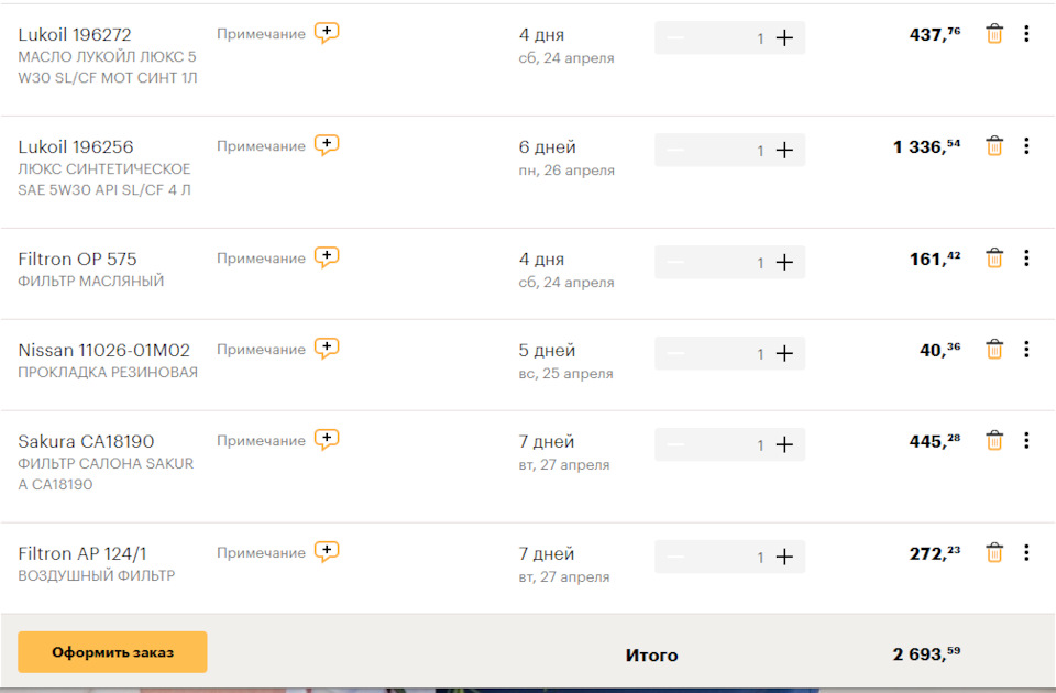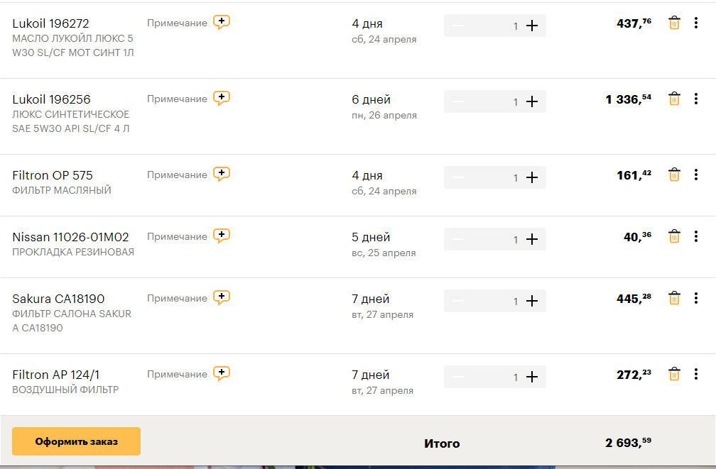 Масло буду брать IDEMITSU 5W30 синтетика 4 л, заказал в Би-би (1599)