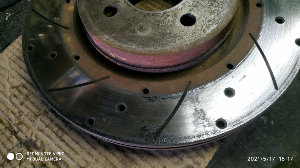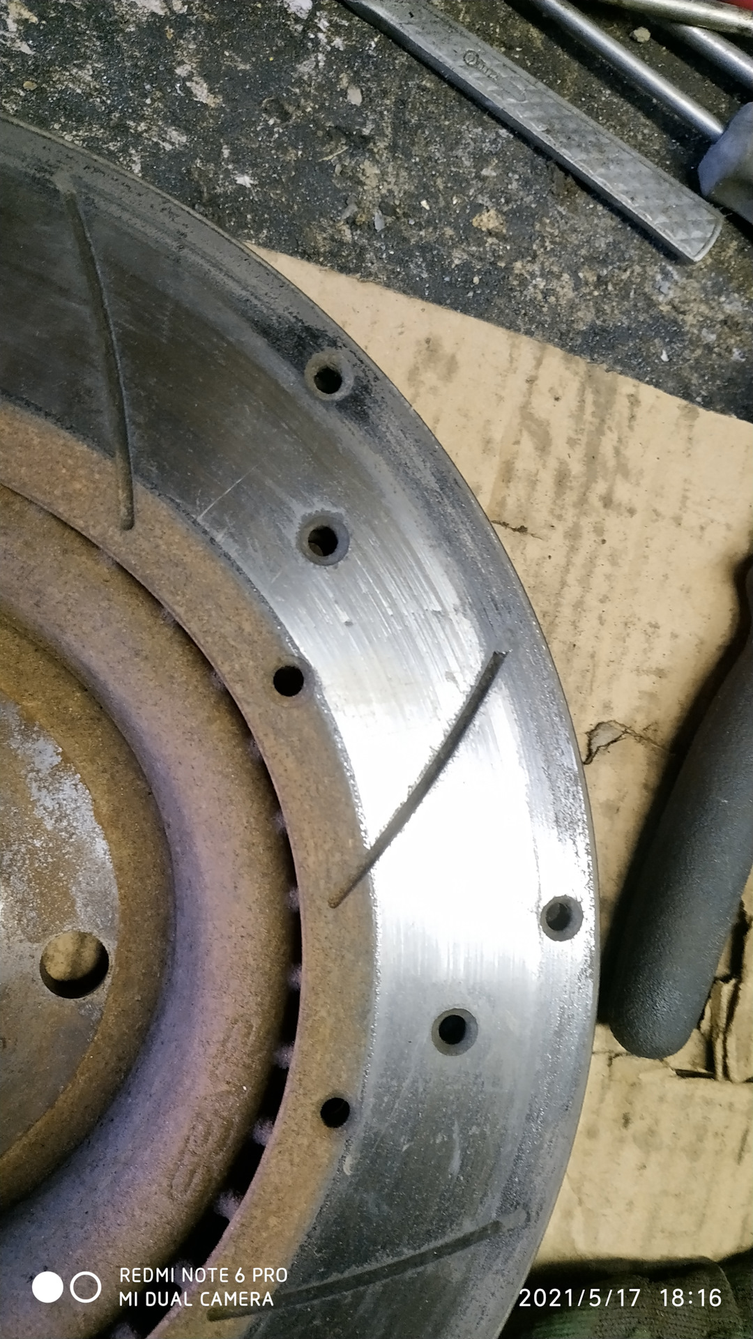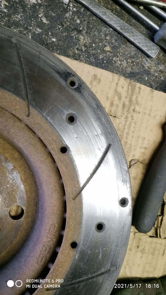 Обратил внимание на буртик, по многочисленным видео поглядел, снять его очень легко. Он и снятию колодок мешает. Взял болгарку, звёл омтор, включил 5ю передачу и за пару минут срезал его болгаркой на вращающемся диске.