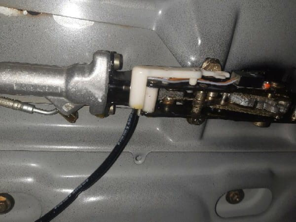 А теперь главное — сделали крышу. Она была рабочая, но при открытии замка, который отщелкивает шток мягкой крыши — слышно было булькание, а после всего и течь масла с крышки отдела для крыши, которое потом пятнами блестело на крышке багажника, ну значит течь, значит надо найти и устранить. С поиском течи AndreiGapanovich справился быстро — снял обшивку и увидел виновника — это гидроцилиндр, отвечающий за открытие/закрытие замка крыши
