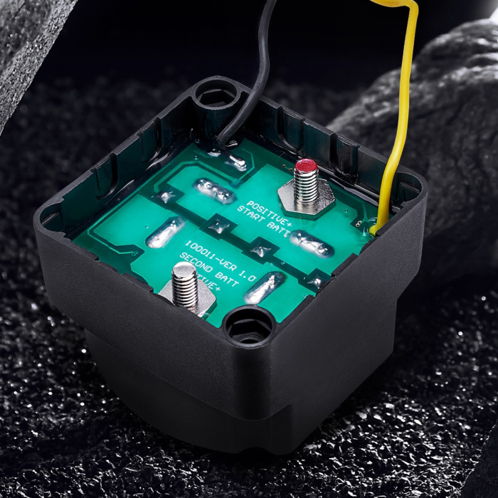 Внутри коробочки два винта. На один идет плюс с стартовой батареи, на второй идет плюс сервисной батареи. Еще два своих проводка питания. Плюсовой я подумав кинул на винт стартовой батареи прямо внутри коробочки — зачем его куда-то тянуть.