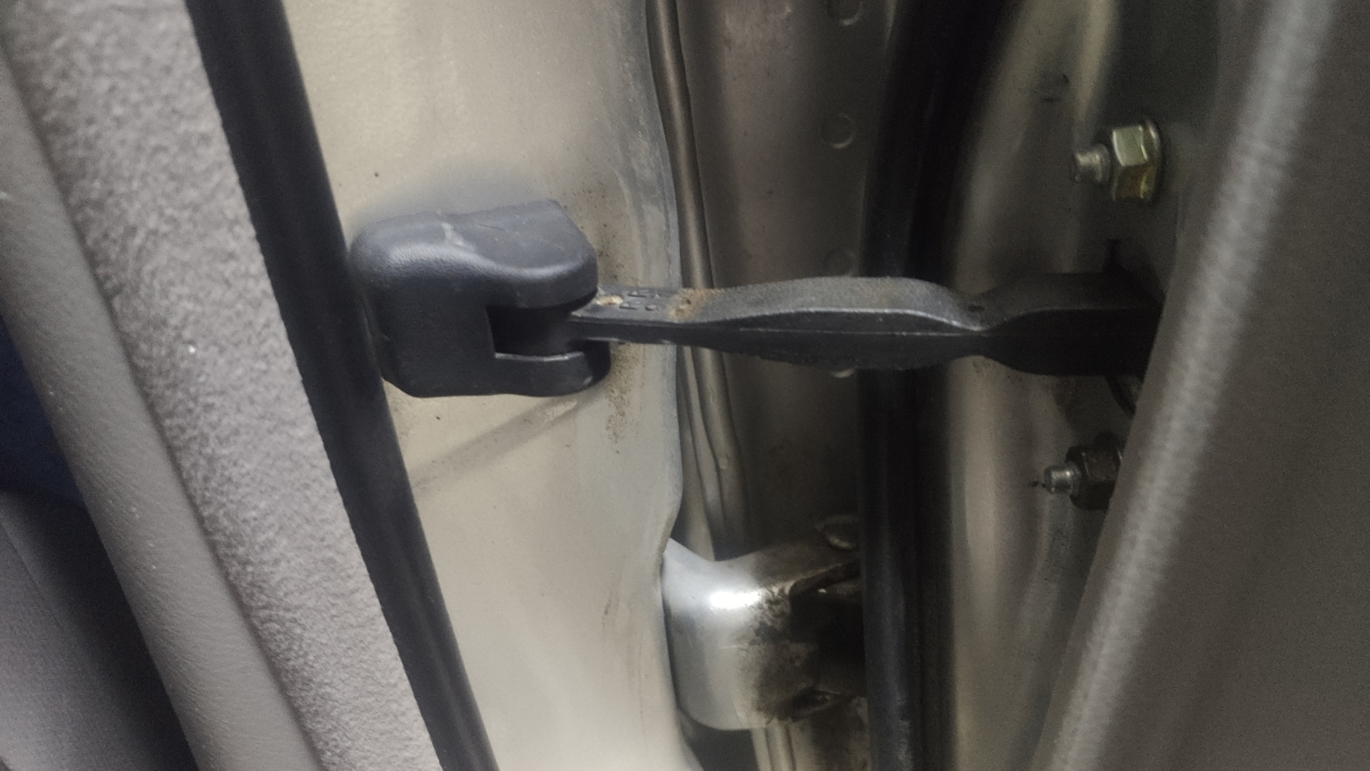 На передних дверях не совсем болтон все встает. Потому что внутри двери усилитель петли стоит. Если просто затянуть гайку на ограничителе то примнеться отверстие под болт ограничителя. Не совсем это аккуратно будет сделано. По хорошему надо отпилить кусок ограничителя чтобы он сел нормально там. Я так и сделал