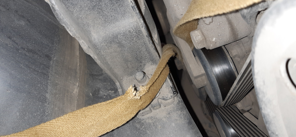 Ну и сам процесс замены. Снимаем корпус воздушного фильтра. Снимаем правое колесо и отстёгиваем защитный экранчик, чтобы добраться до шкива коленвала. Сверху продеваем веревку под коромысло натяжителя ремня.