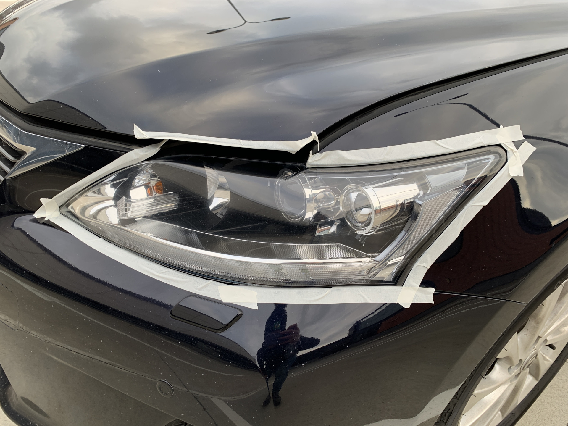 Шаг 1. Хорошенько отмываем фары и задние фонари (использовал бытовое средство для чистки окон) и закрываем края ЛКП малярным скотчем, чтобы PlastX не попал на краску.