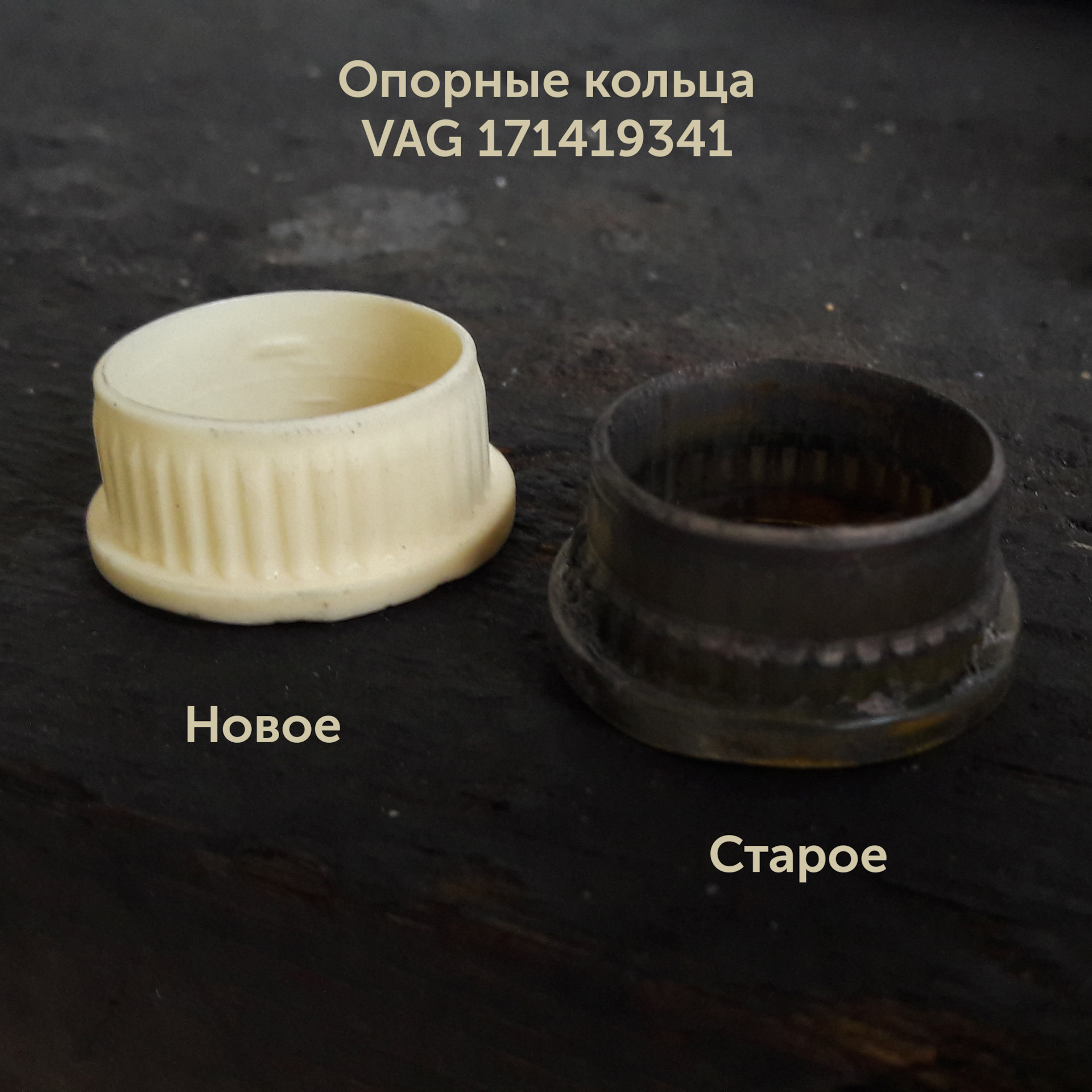 Приветствую всех. Как-то я искал размеры соединительной муфты VAG 171419549. Хотел заказать ее у токаря или отпечатать на 3D принтере. Не хотелось покупать и ждать месяц. Но к сожалению не нашел размеры и пришлось покупать, стоимость 400 руб. оригинал. У меня на машине она была обрезана и разрезана вдоль, из-за этого рулевое колесо сильно прижималось к подрулевым переключателям, а рулевой вал ходил от себя и к себе. Если своими словами то, ее роль заключается в том что бы, выдержать нужное расстояние между подрулевыми переключателями и рулевым колесом и так же она не дает рулевому валу ходить на себя и от себя. Устанавливал я ее на вал предварительно разогрев газовой горелкой. Села она плотно, демонтировать ее без инструмента просто руками не получится. Что бы ее демонтировать, ее желательно разогреть и снять плоскогубцами. Так же поменял опорное кольцо VAG 171419341.
