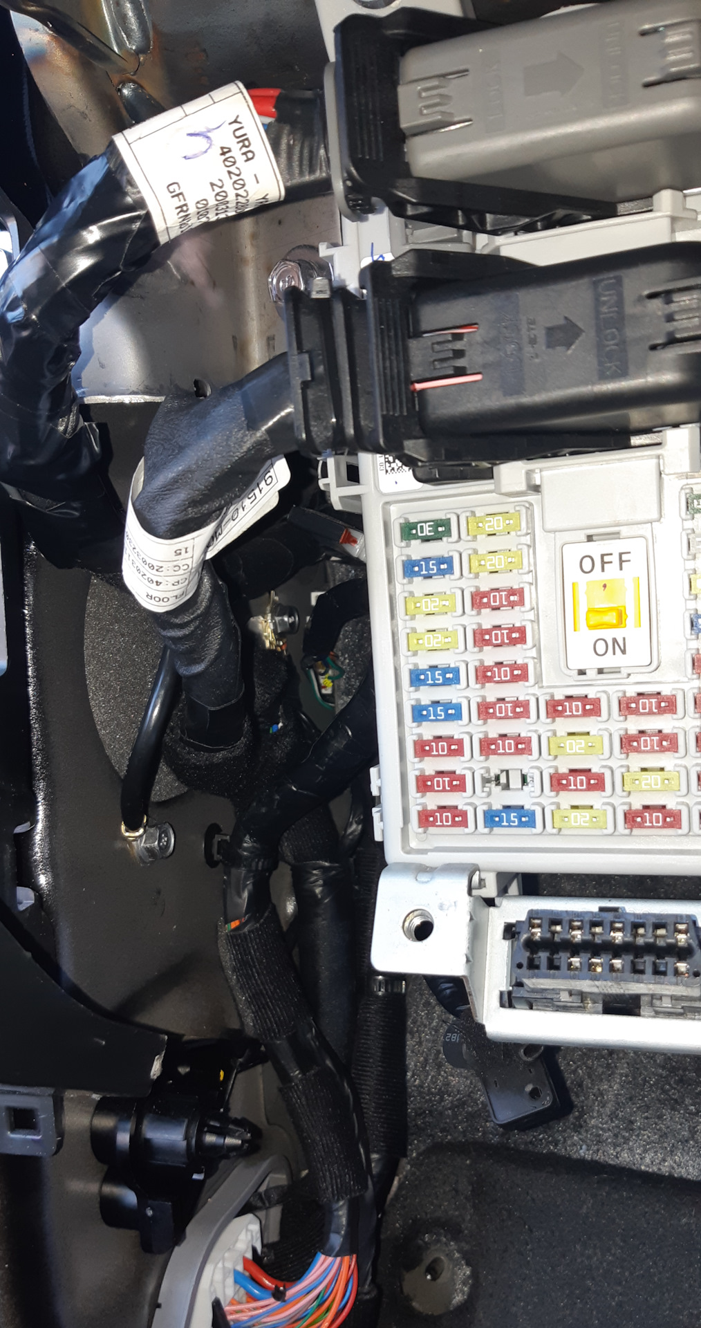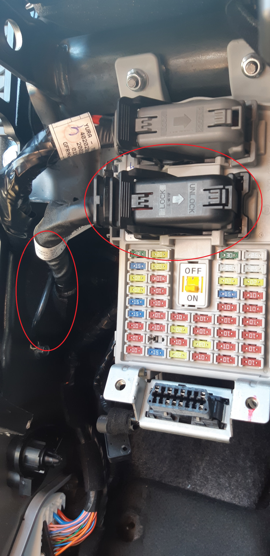 Для начала снял декоративную накладку под рулём, накладку с торца панели, рукоятку открытия капота и декоративную накладку внизу возле водительской двери. В итоге видим расположение необходимых разъёмов через которые необходимо провести постоянный "+" в дверь.