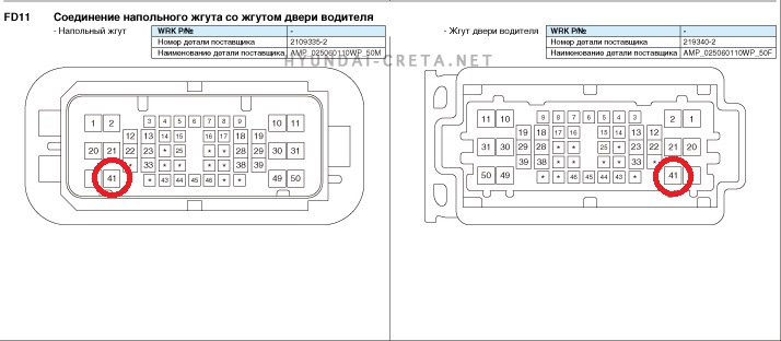 Далее нужно добраться до соединения напольного жгута и жгута двери водителя (FD11) и согласно схемы вставить контакты 1-968851-1 (в разъём двери водителя) и 2-964296-1 в разъём напольного жгута. Предварительно обжав их на проводах.