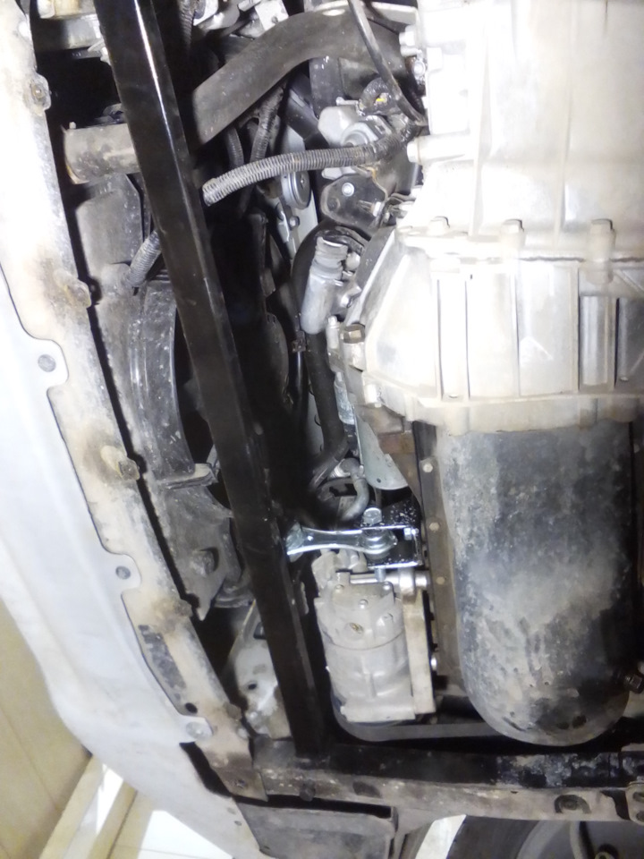Болт один фиг неудобно вставлять. Впору ставить поперечину с уже прикрученной опорой. Либо вставлять болт головкой в сторону КПП, концом в сторону компрессора кондиционера. Но тогда гайка и конец болта оказываются в подозрительной близости от трубки, выходящей из компрессора.