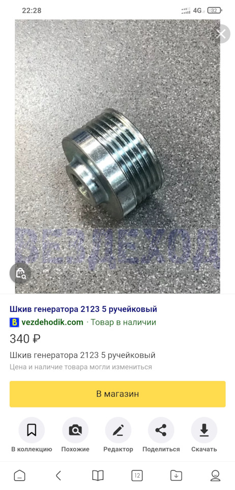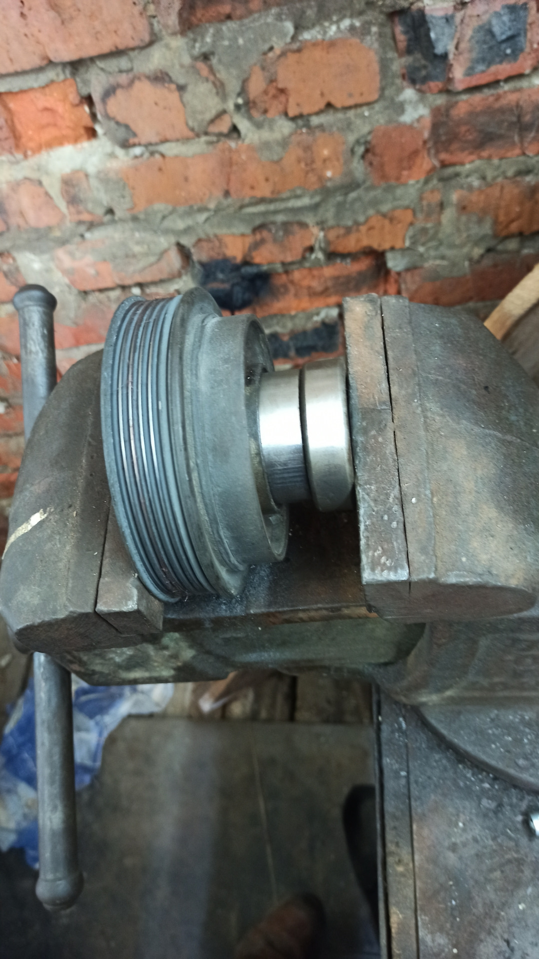 По ходу сборки обнаружил что демферный шкив генератора приходит концом, от него тоже исходили своеобразные звуки. Взял генератор в руки, и пошел в автозапчасти. Вооружившись линейкой и штангелем, подобрал шкив и гайку. Встал хорошо, гайку болгаркой распилил попалам, постольку гайка широкая. Хорошо зятянул, установил генератор на место, перекоса ремня не замечено. В дальнейшем заменю на обгонную муфту.