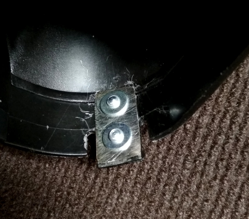 Получилось отлично. Между пластиком и пластинкой — подложены шайбочки, чтобы закруглённую защёлку не расколоть при утяжке клёпки.