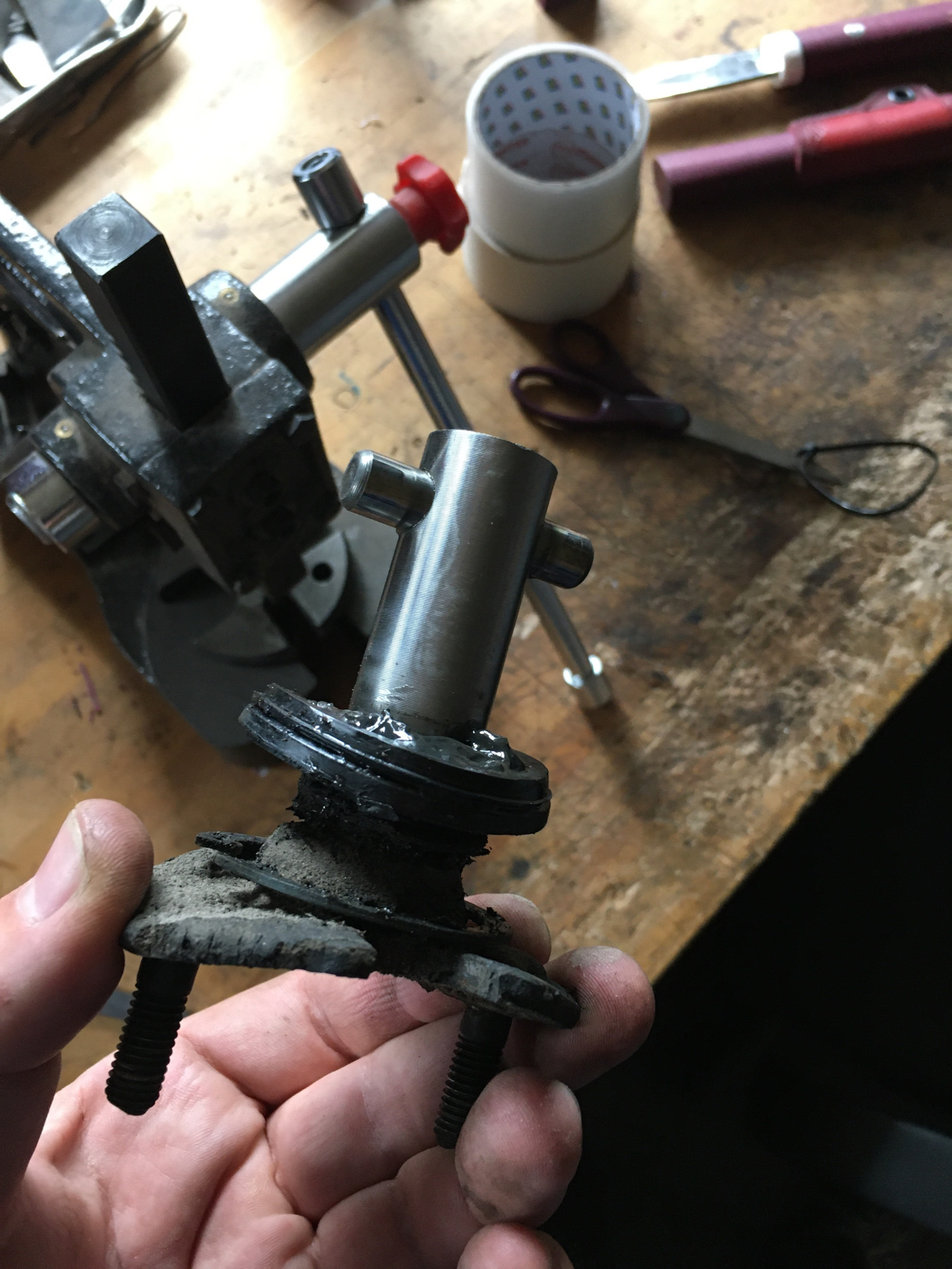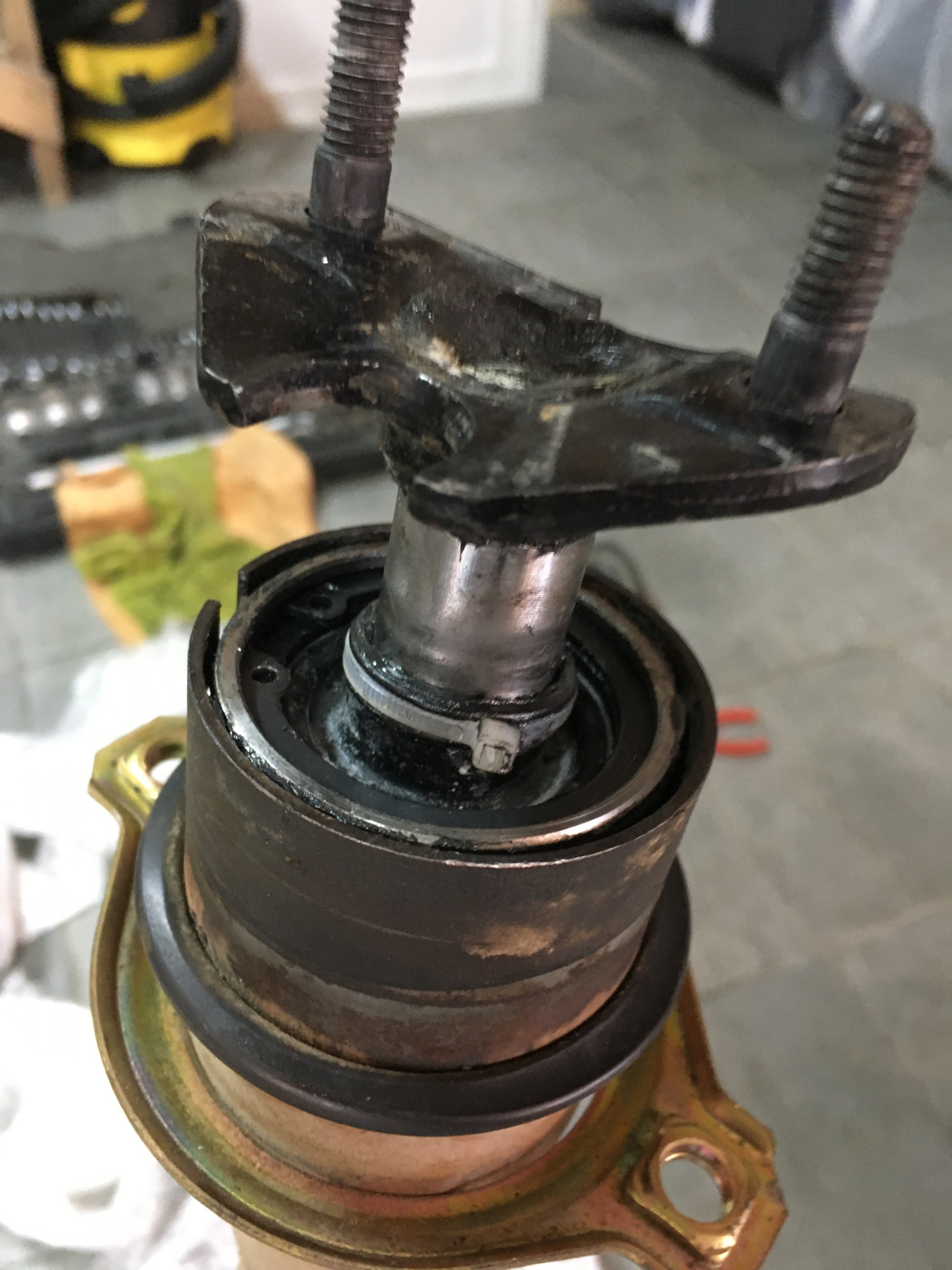 Теперь всё чистим от старой смазки и стягиваем старый сальник. Для этого совсем не надо выпресовывать ось сухарей (я пытался, не вышло совсем), можно просто аккуратно его растянуть и снять.