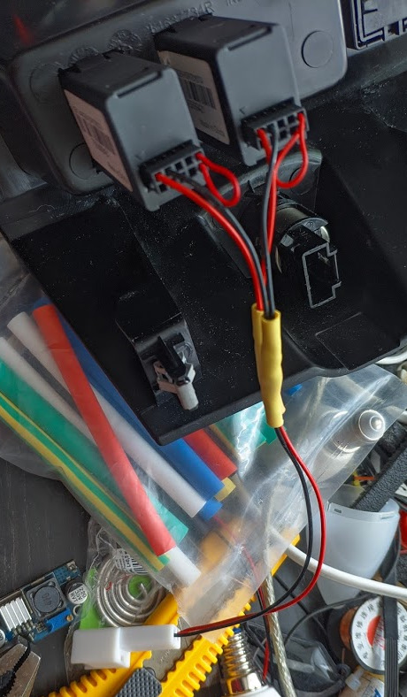 Там один провод, для прикуривателя, перед разъёмом на него зачистил срезав только сбоку изоляцию, залудил и припаял. Просто на пайке не делал фото.
