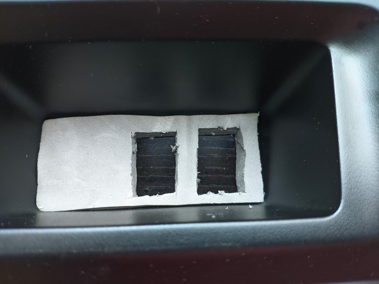 Единственный косяк — пластик режется с помощью канцелярского ножа покрепче и такой-то матери, рассверливание первого прямоугольника было лишнее(стандартный метод для твёрдого пластика — сверлим периметр и прорезаем по дыркам) — больше чем надо вышел, вручную вырезал ножом просто идеально(режем чуть меньше и подрезаем края, пластик мягкий)