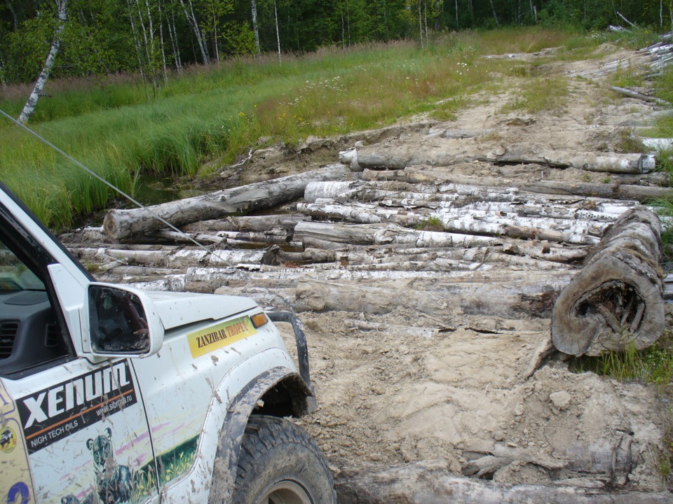 ввиду того, что дорогой до переправы пользовались преимущественно зимой, мы нашу поездку с первого раза не осилили, т.к. не взяли даже бензопилы. доехали до первого размытого напрочь мостика через лесную речку и поняли, что фиг мы ее переедем. берега уж больно обрывистые и крутые. да еще и очень смущал тот факт, что вокруг вся трава была примята косолапым буквально только что. причем не косолапым даже, а косолапой в добавок еще с малышом (следы большие и рядом маленькие).