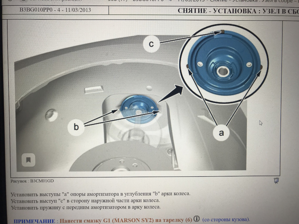 В одном из бортжурналов я прочитал, что этот хлястик (метку) надо направить на крыло, также нарисована стойка в каталоге запчастей. Когда я так выставил метку, получилось, что опора совсем уж криво стоит относительно штока. Когда я повернул эту метку в сторону двигателя, плоскость опоры стала более перпендикулярна штоку и чисто на взгляд это выглядело правильней. Так и поставил. Печенька от DS Citroen/Peugeot 5033.F9 встала идеально. Притянулась верхней гайкой (видимо до железа) и немного сжалась, исключая малейшие подвижки.