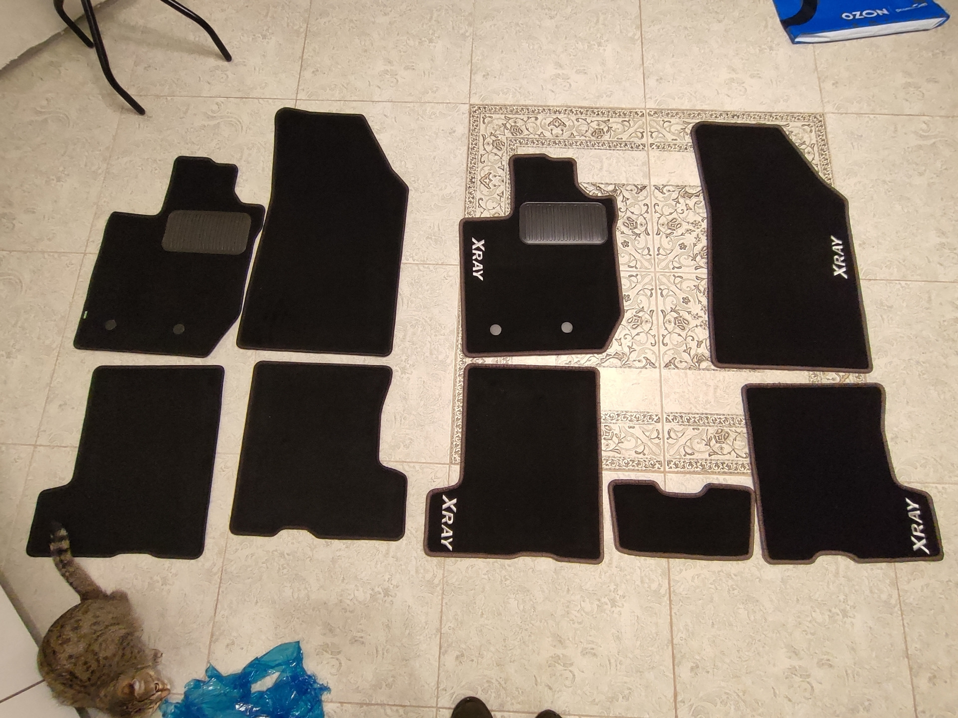 Оба комплекта брал на Озоне, с надписью Xray стоили 1000 рублей с копейками, а второй комплект обошёлся в 350 рублей, увидел такую цену, не смог удержаться и купил. Теперь у меня в салоне два слоя ковриков, первым слоем лежат с надписью Хрей, они на липучках крепко держатся, а сверху уже второй комплект, качество ворса у него такое же, но нет липучек, что позволяет их легко доставать и вытряхивать с них пыль и песок без постоянного дерганья липучек.