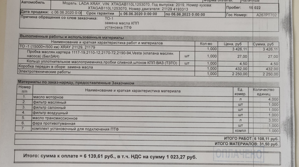 В конце мая было пройдено ТО-1 в автосалоне Луидор-Лада, стоимость работ по прайсу 3600 рублей. Остальные расходники (масло в двигатель, масляный, воздушный и салонный фильтры) были приобретены самостоятельно. Масло в движок как обычно Lukoil Armortech 5w-40, фильтр масляный Mann 914/2, воздушный фильтр BIG Filter, салонный угольный фильтр тоже BIG Filter. Всё вышло по цене около 3 тысяч рублей.