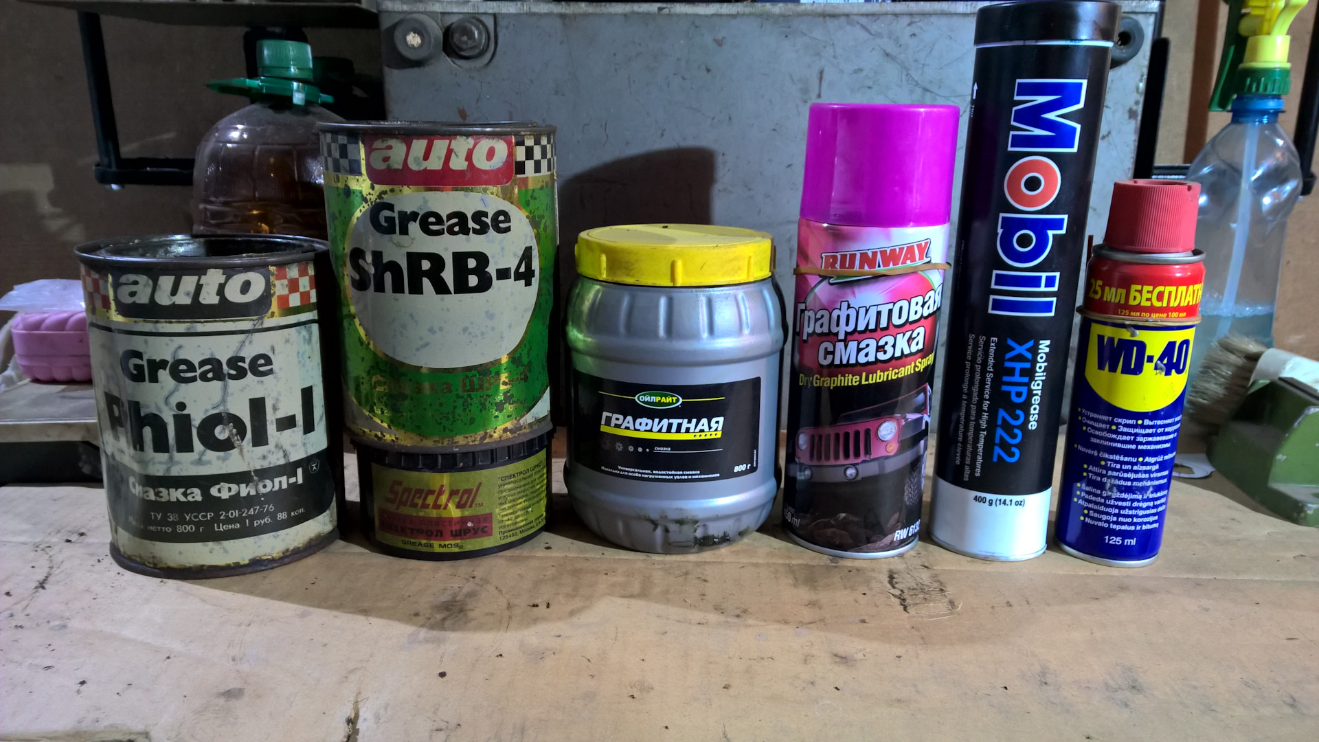 Литол есть, Мобил двух видов есть (простенький 222 и высококлассный Mobil Grease Polyrex EM, его использую обычно), шрус, графитка, силиконовая с тефлоном, специализированная для тормозов. Вот теперь и ШРБ есть.