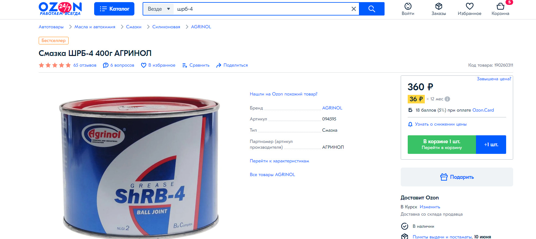 В наличии в магазинах найти сложно, но заказать не составляет проблем. Брал оригинальный вариант производства Agrinol (Украина). Банка 400 гр. обошлась в 228 рублей. Артикул привести не могу, потому что он не указывается. В разных магазинах указан свой. Я покупал в avtoall.ru (не реклама).