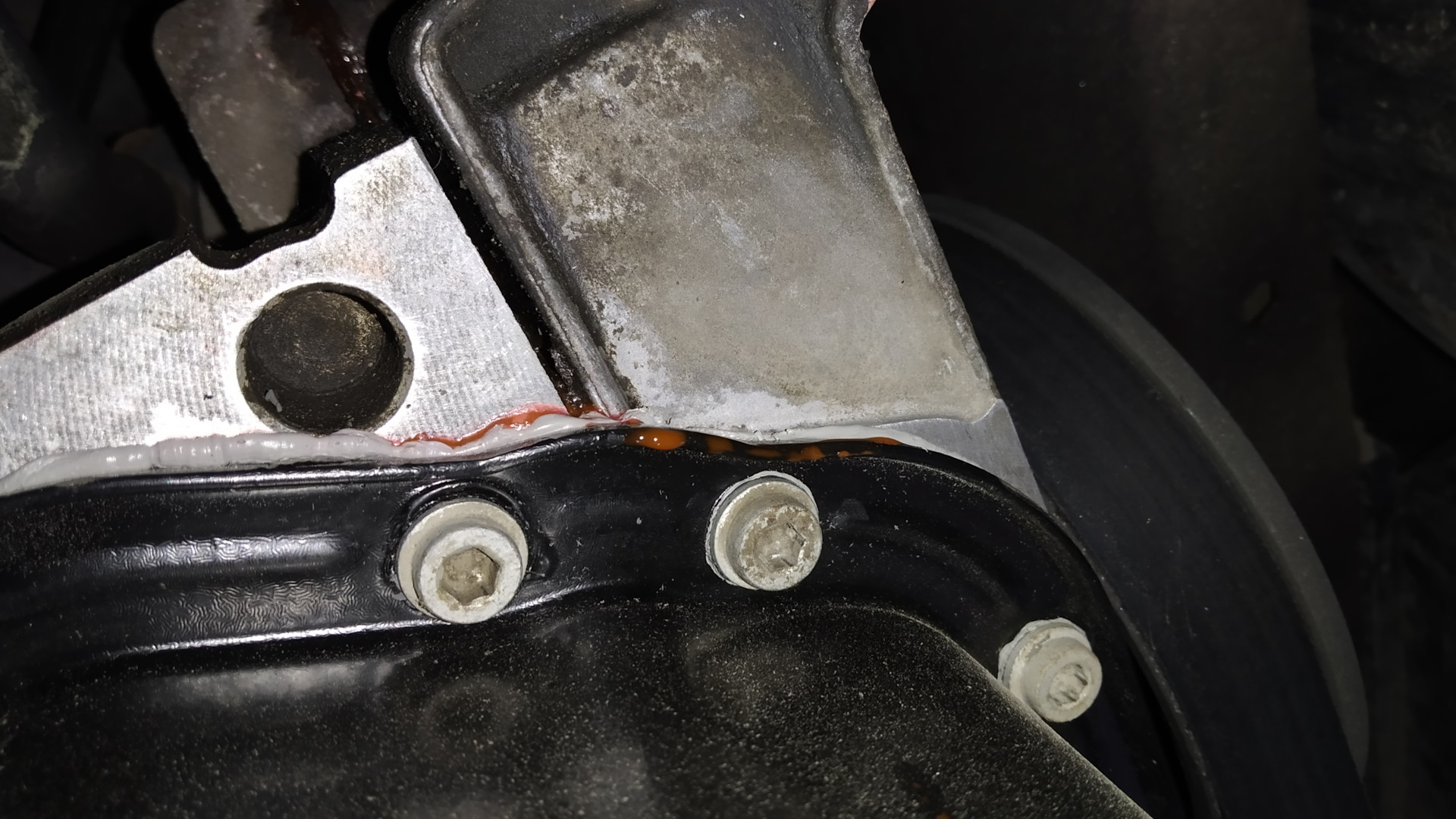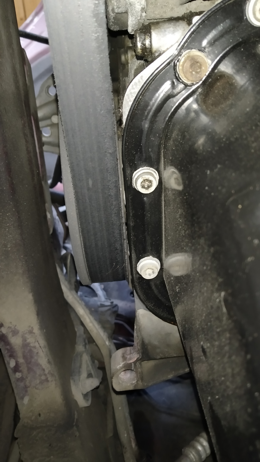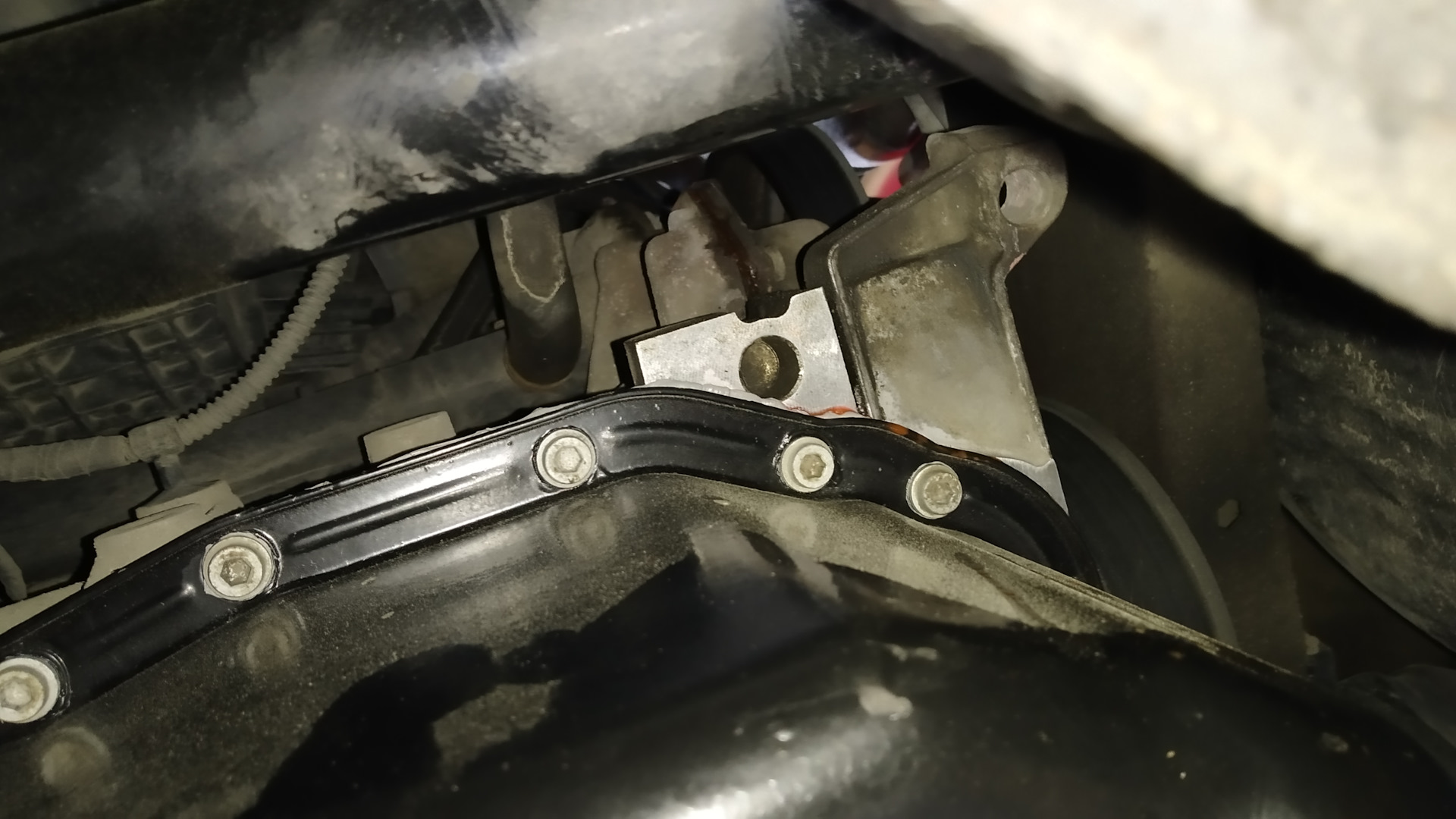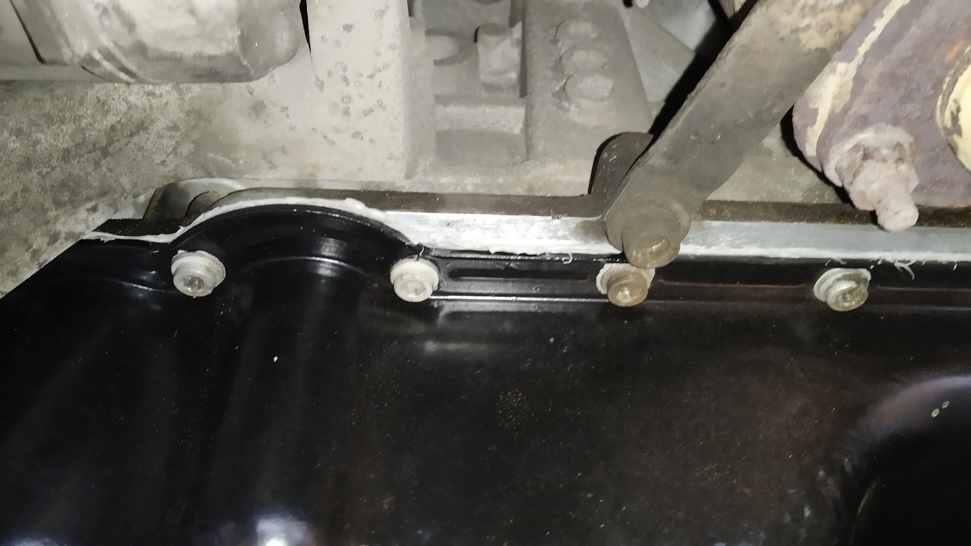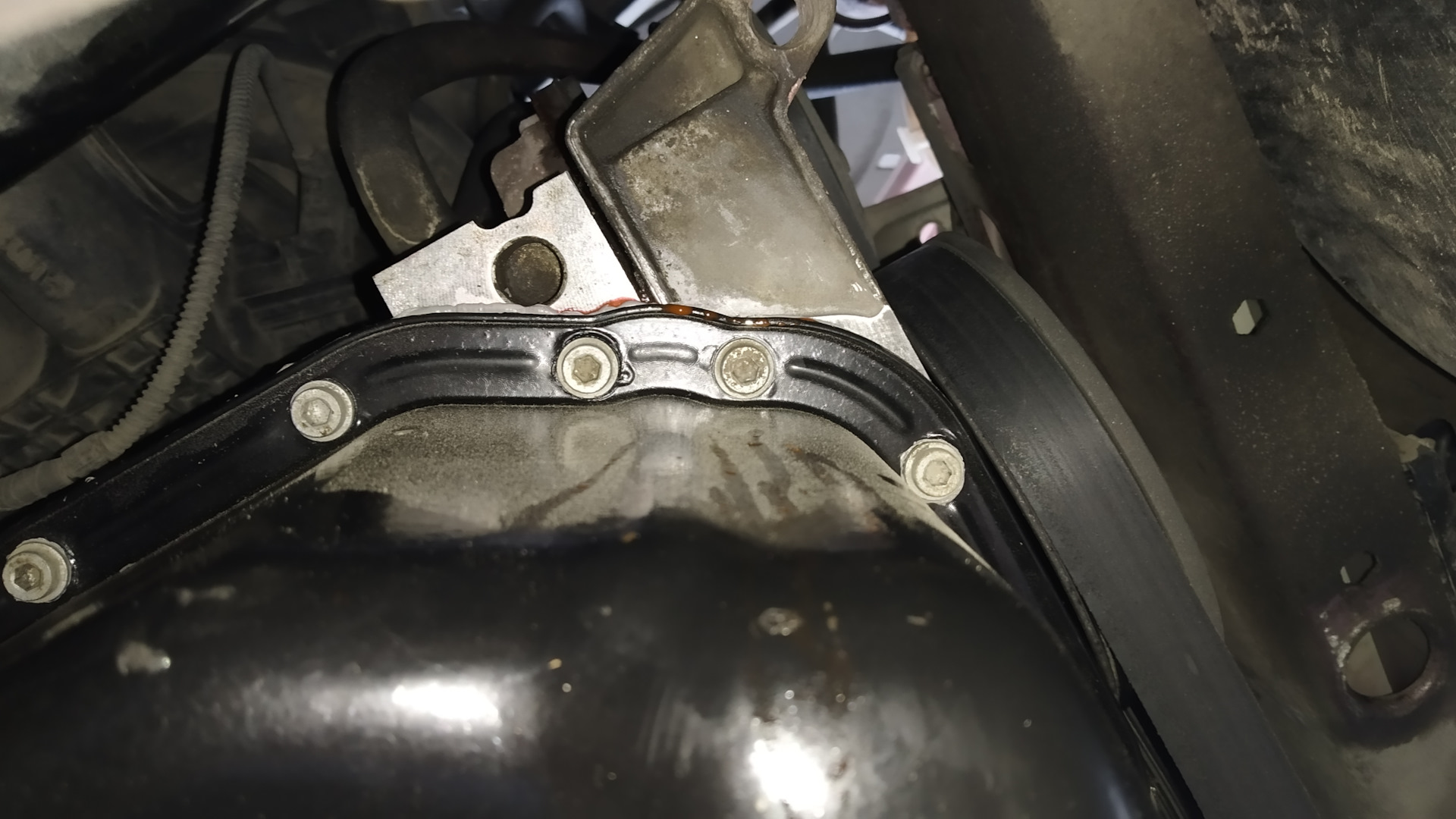 Снял защиту двигателя — с целью проверить, как там поживает мой недавно отреставрированный поддон. Кстати, для установки поддона на место использовал дешманский герметик Felix серого цвета. Посмотрим, сколько он продержится.