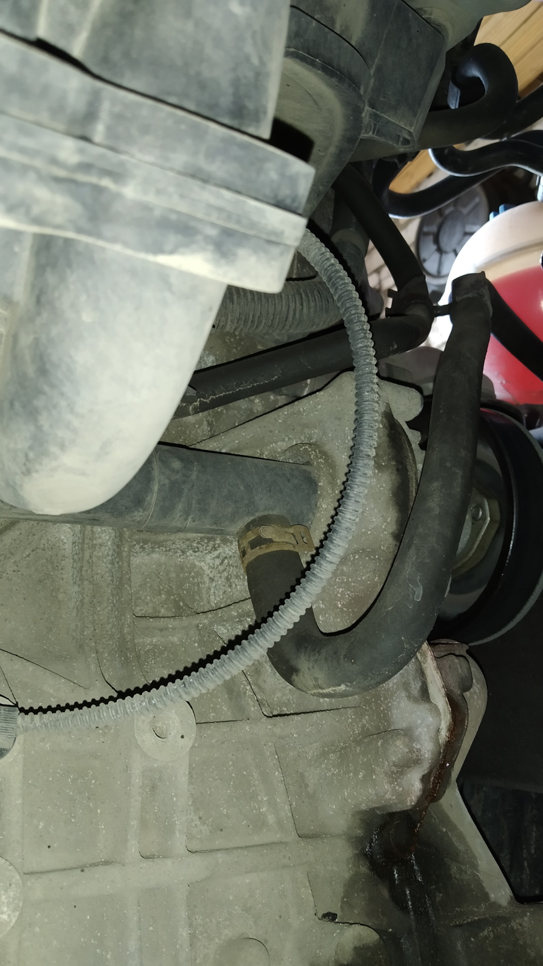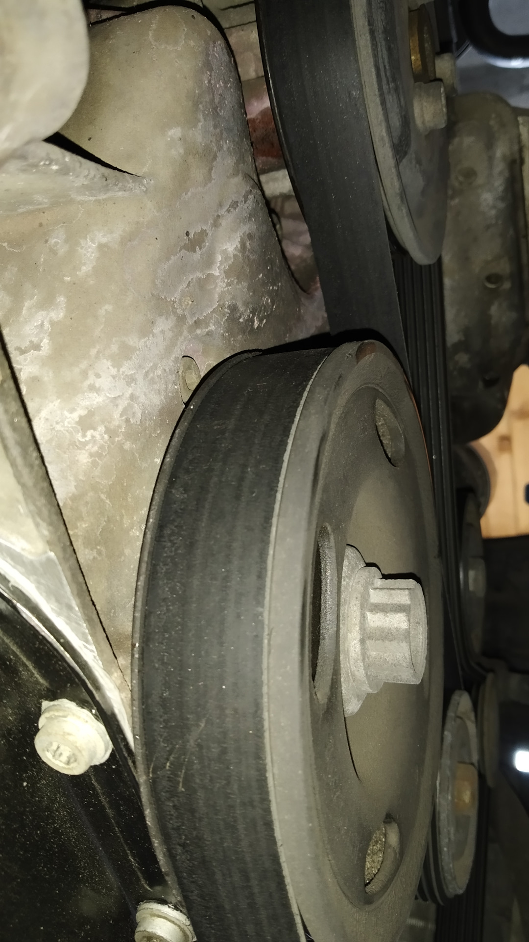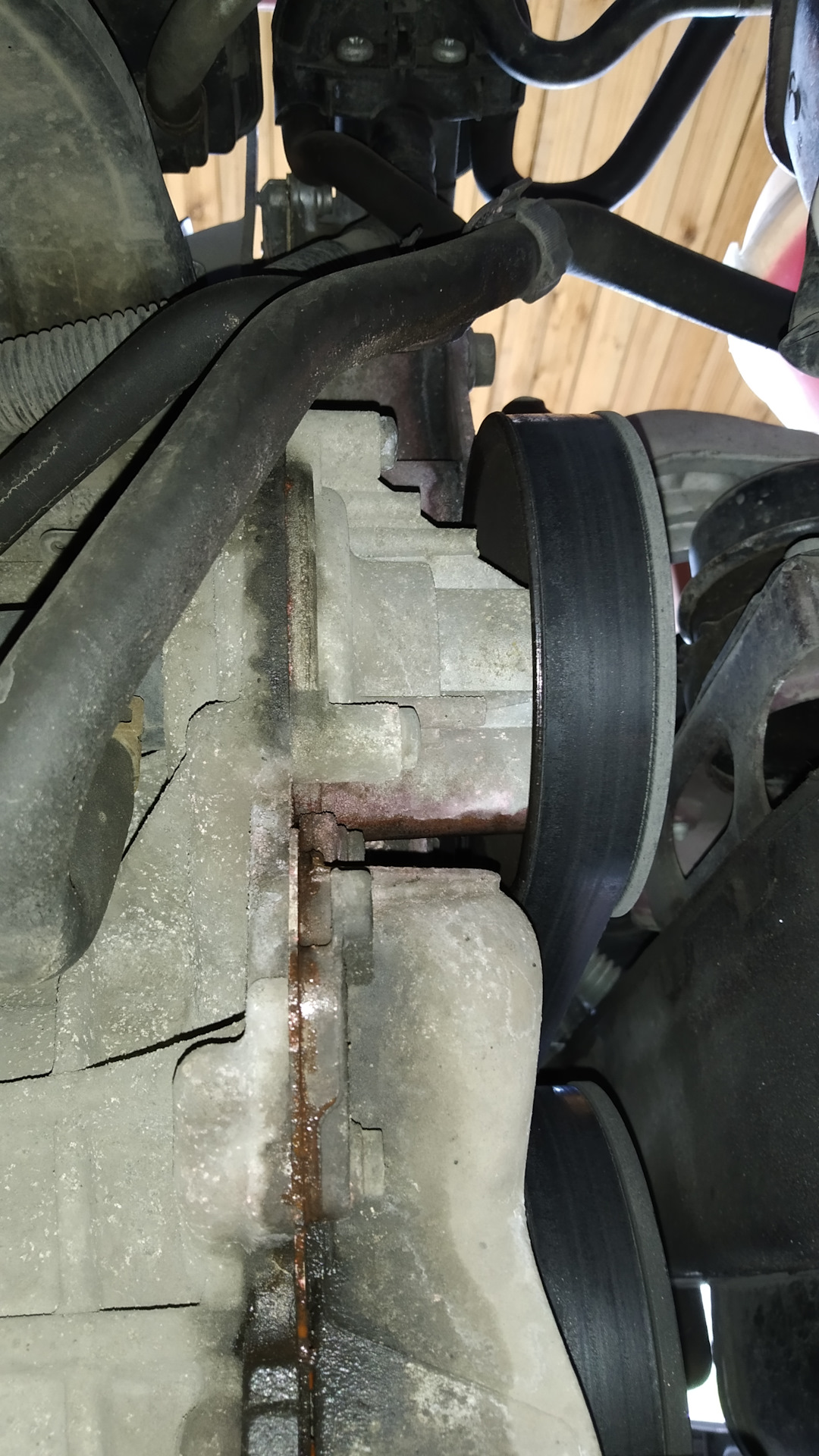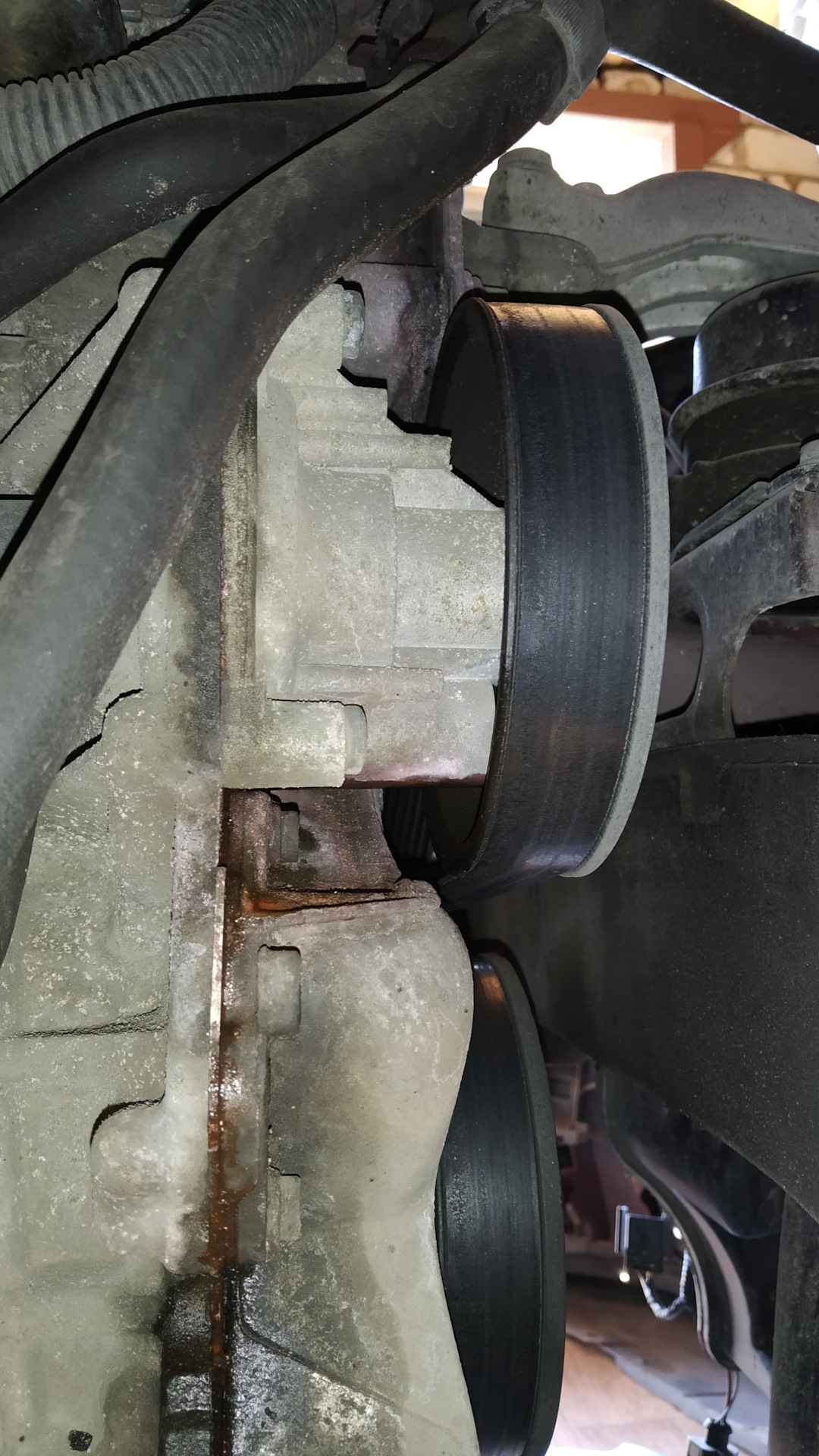 Помпа, либо прокладка из-под неё — непонятно откуда течёт. Чуть позже выяснил — течёт помпа. Заменена.