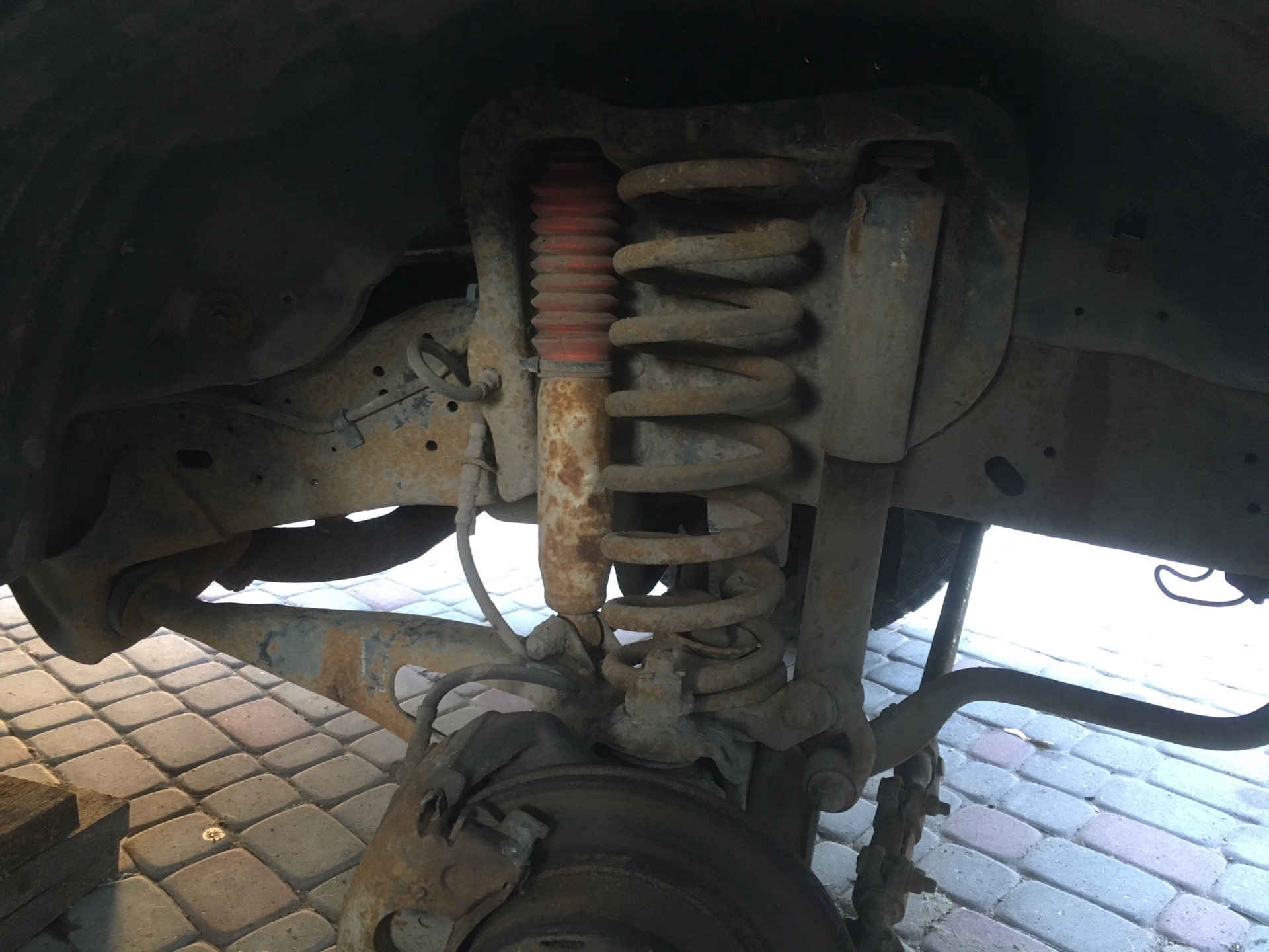 На выходах первым делом пошёл менять пружины. Старые выпали практически просто от поднятия машины домкратом за раму. Они были более короткие, и явно не родные.